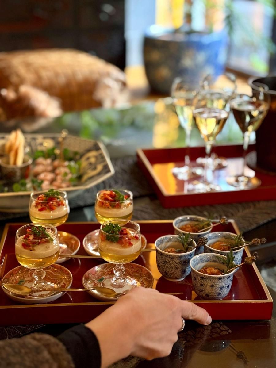 ☆硯蓋の歴史は古く、もとは硯箱の蓋を用いたところからの名です。硯箱の蓋は、平安時代から色紙をのせたり、桜の枝を入れたりして用いられており、のちに口取り肴などを盛る器として使われ始めました。「硯蓋に果物を盛ることは江戸初期から行われ、近年も干菓子を硯蓋に盛ったりしている」と19世紀初めの書物に記述があります。