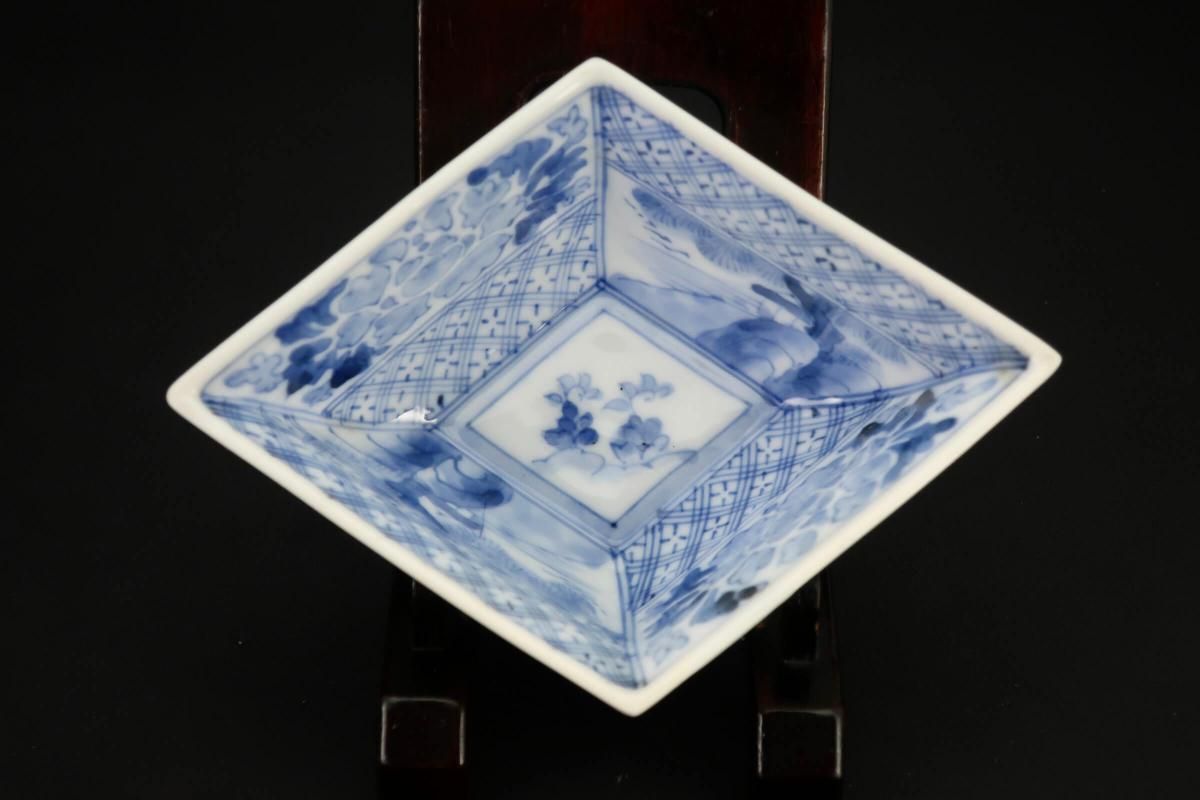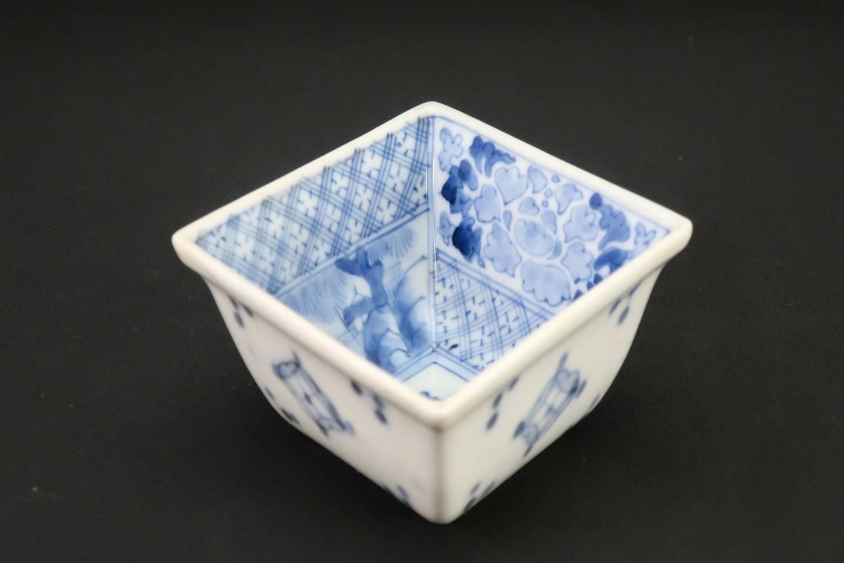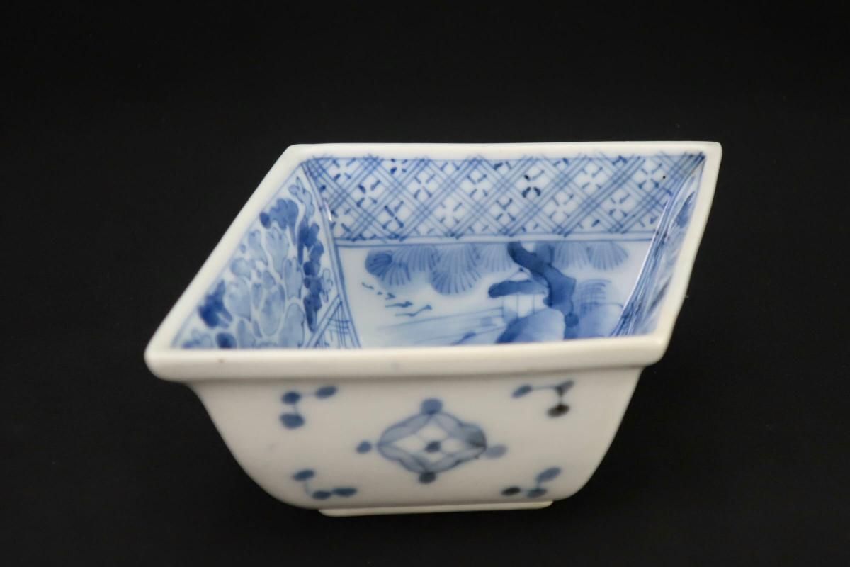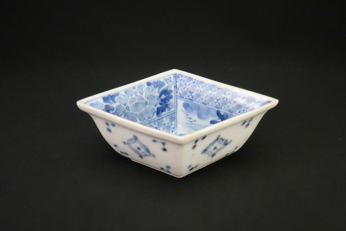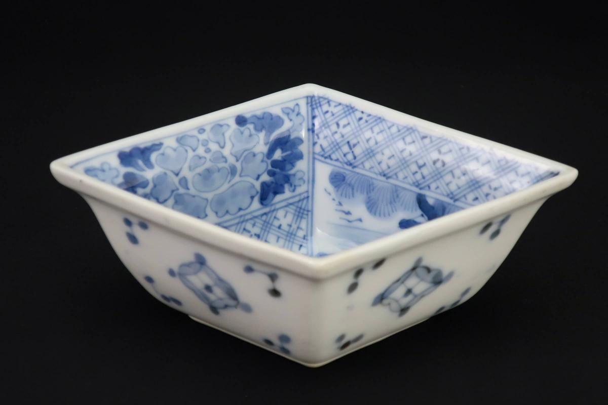 ☆ソフトなブルーとシャープな菱形が魅力の小鉢。大正時代の伊万里の器はお洒落で独特の魅力があります。和食だけでなく、様々な料理を盛り付けてお楽しみください。