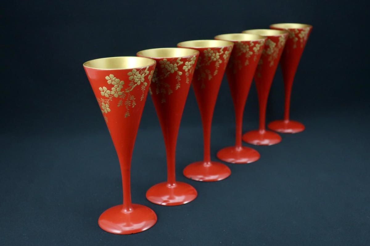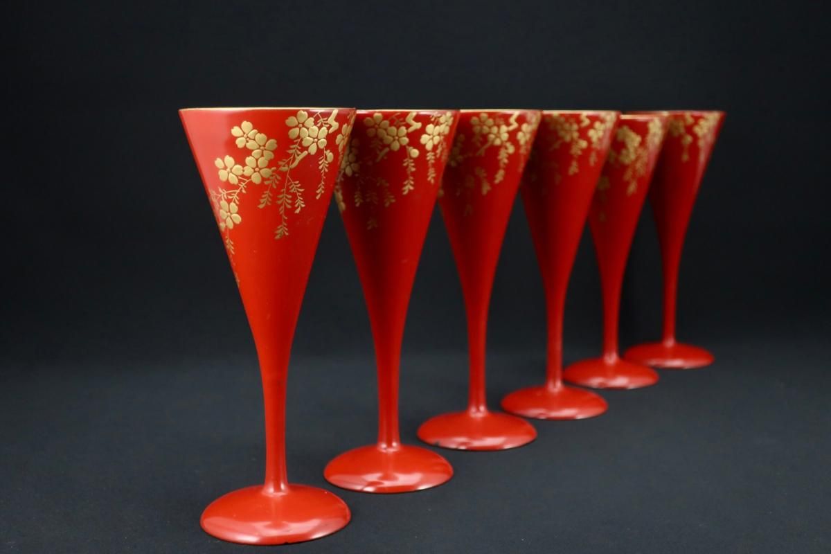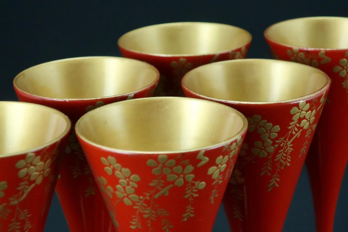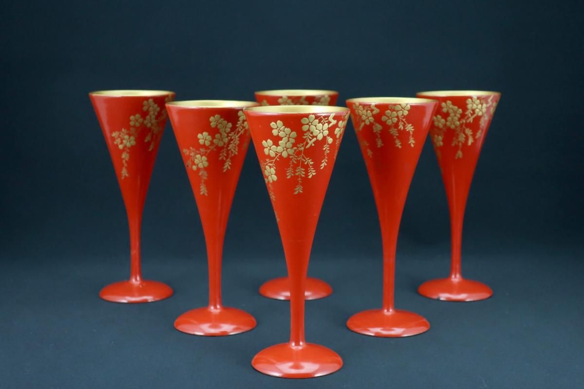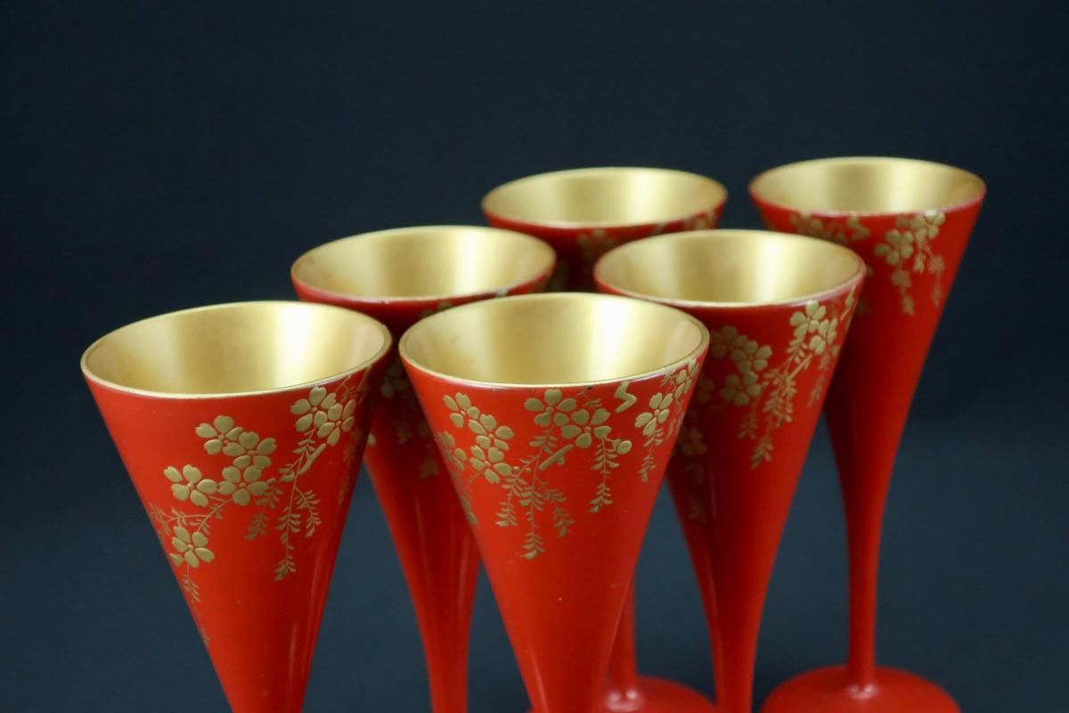 朱塗内金桜蒔絵脚付酒盃 六客組 / Red-lacquered Sake Cups with 'Makie' picture of Sakura set of 6