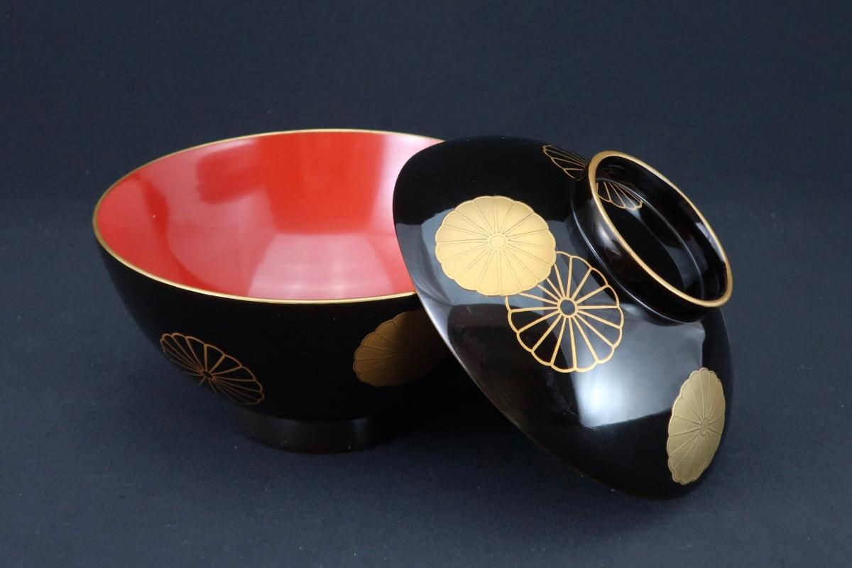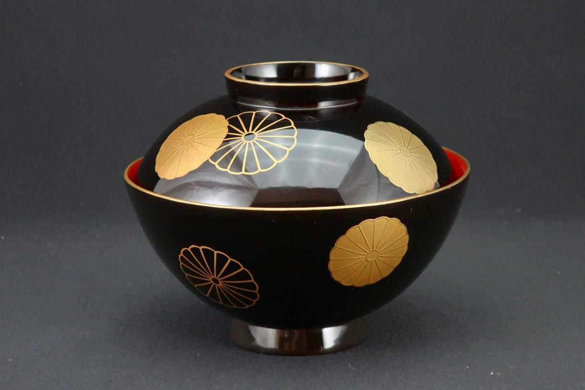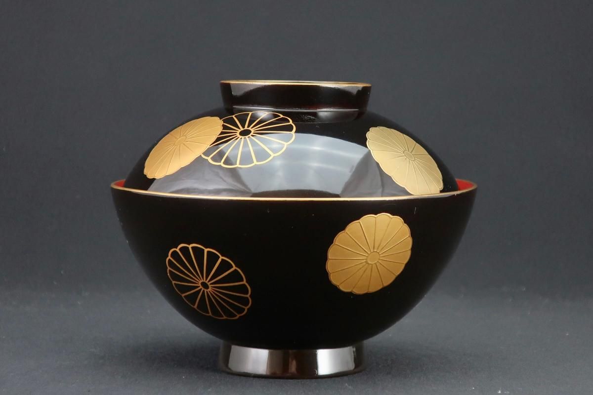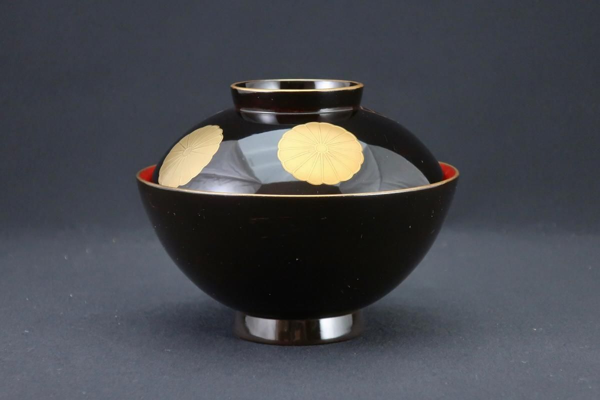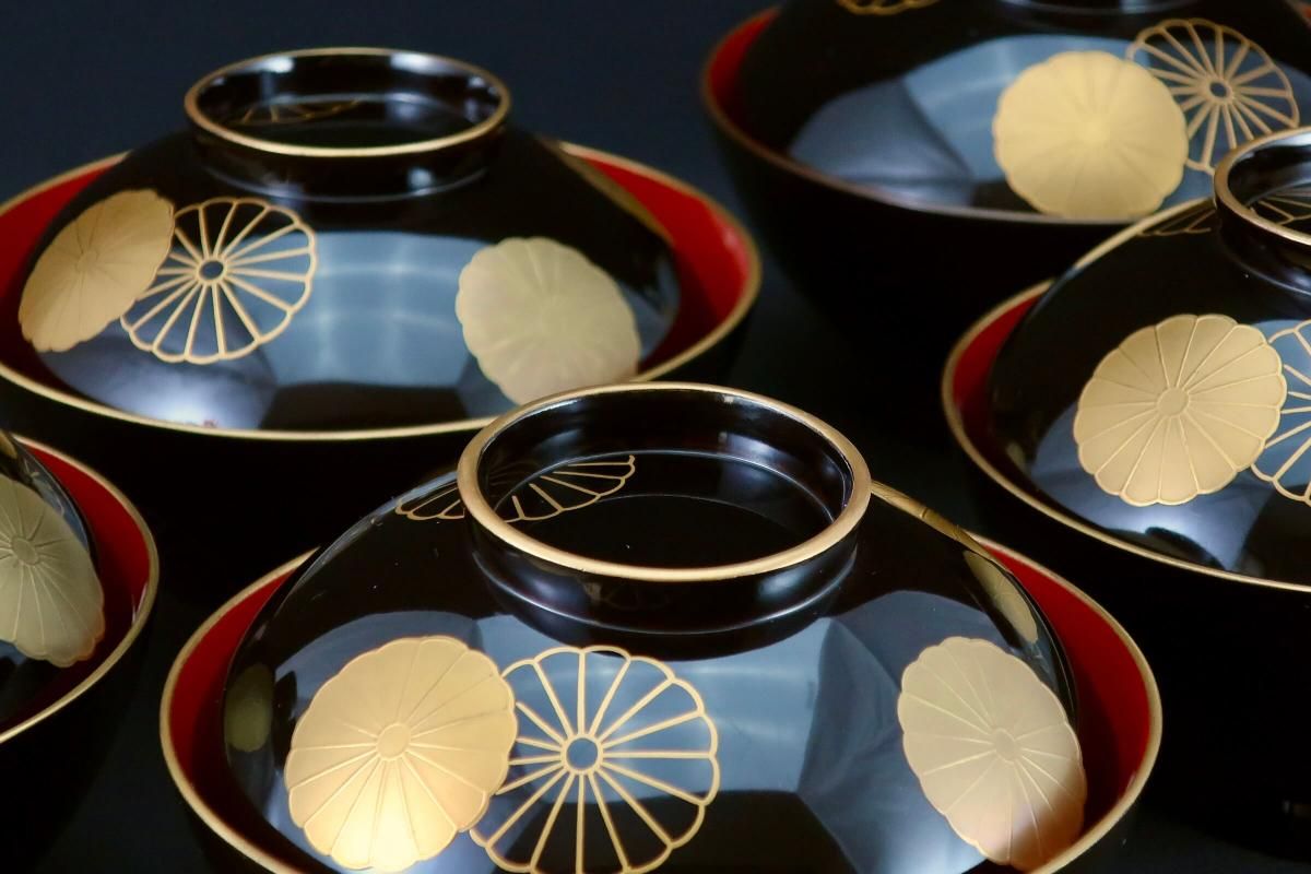 黒塗内朱菊蒔絵吸物椀 五客組 / Black-lacquered Soup Bowls with Lids set of 5-1.2