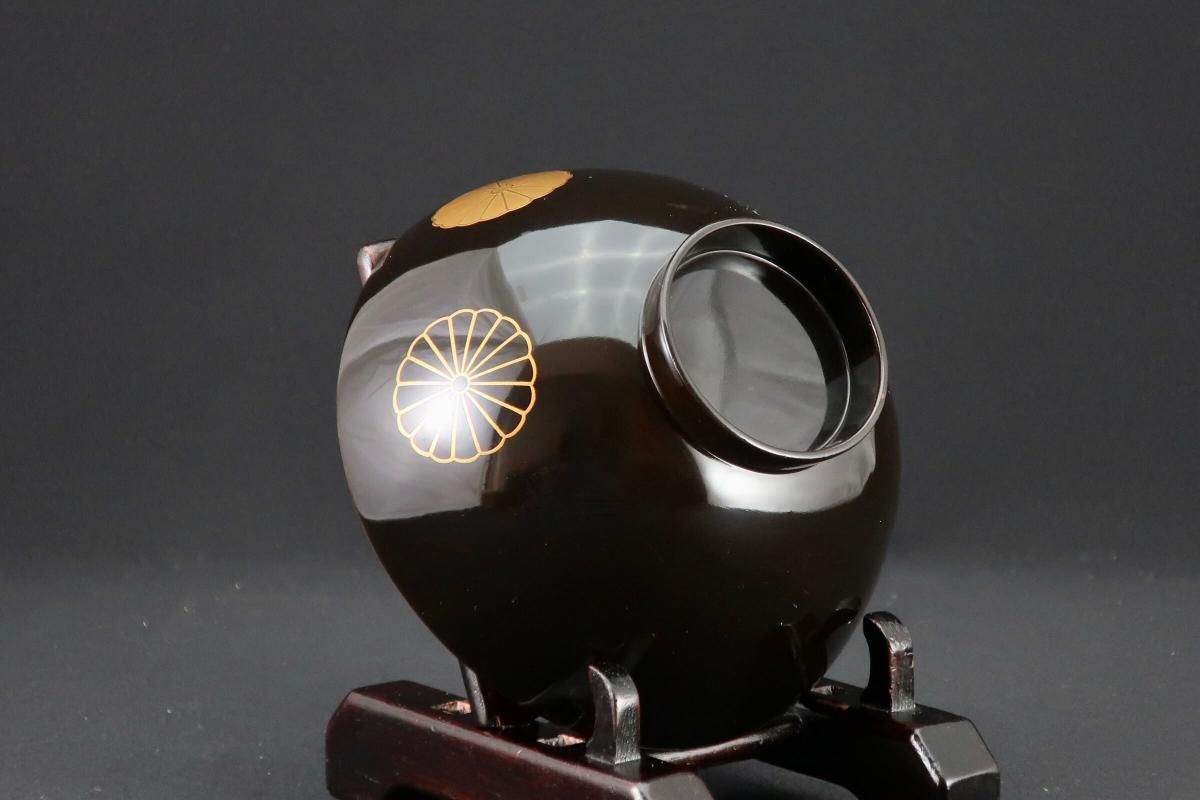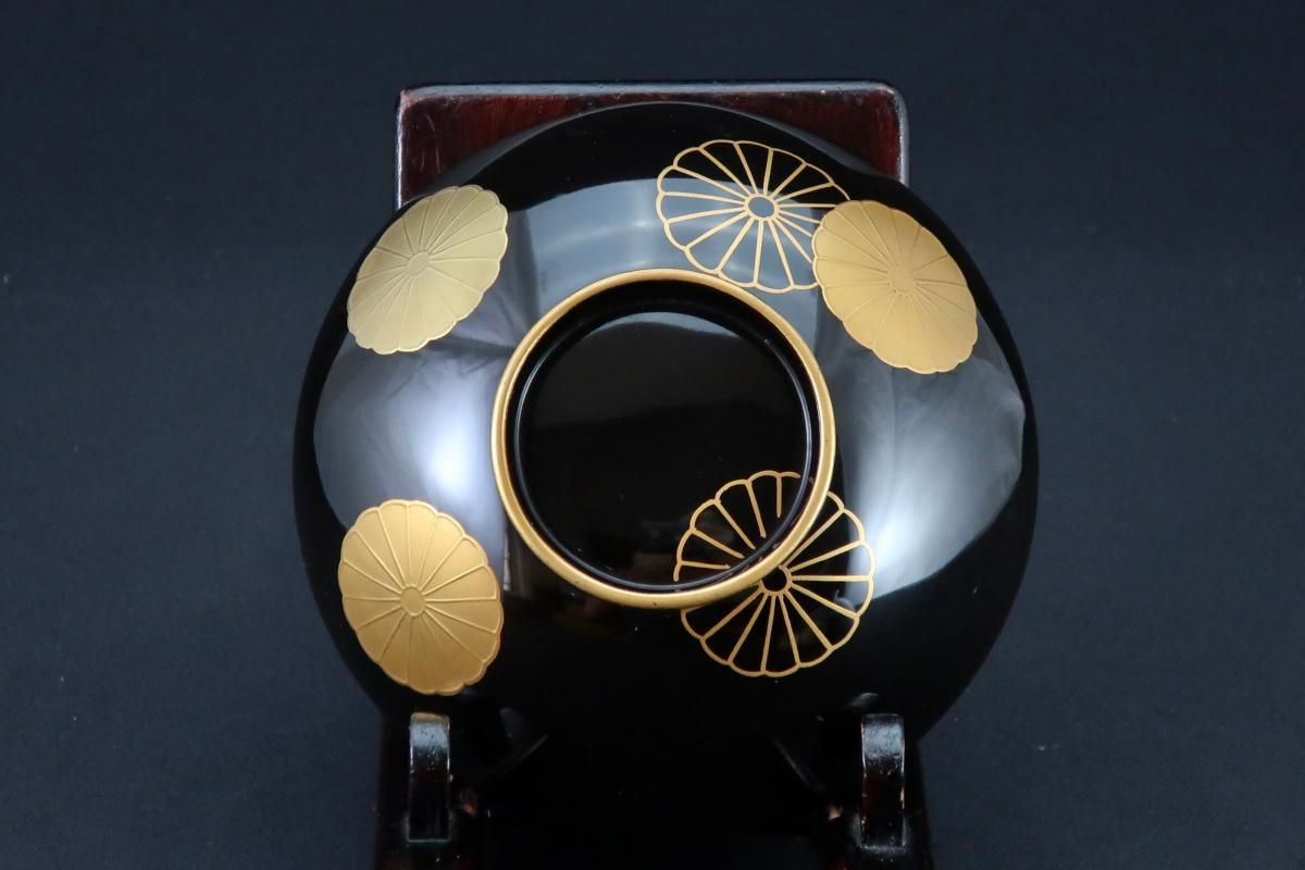 ☆重ねた菊の金蒔絵が美しい吸物椀。開けた時に鮮やかな朱塗の色が目に飛び込んでくるこんなデザインは古いものによく見られます。一年中使える菊蒔絵ですが、重陽の節句の際など秋に使うのが毎年待ち遠しくなりそうですね。