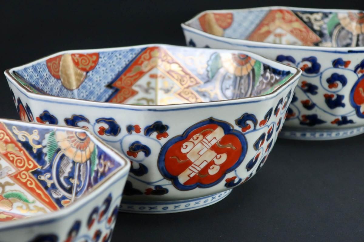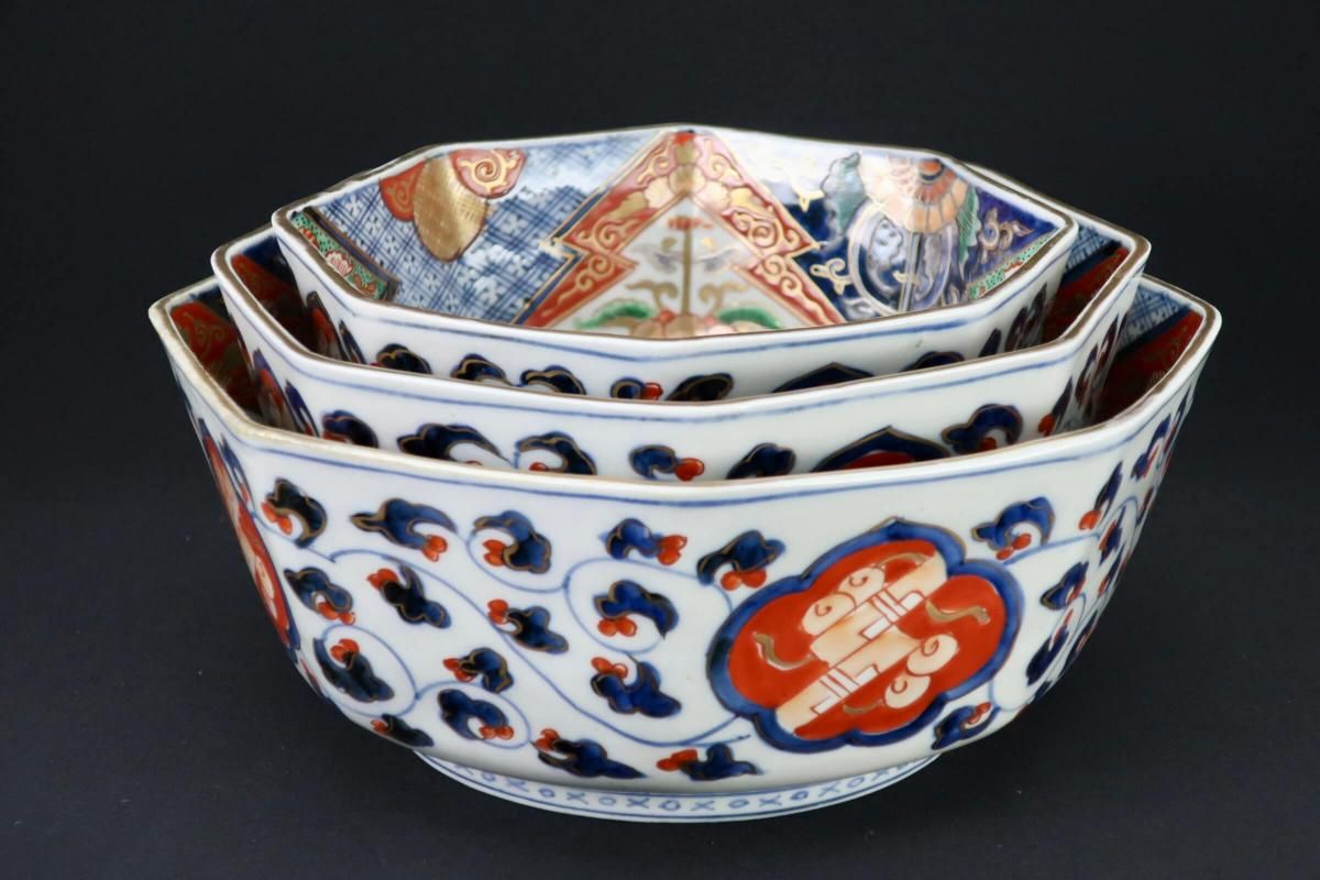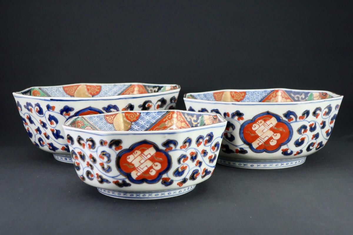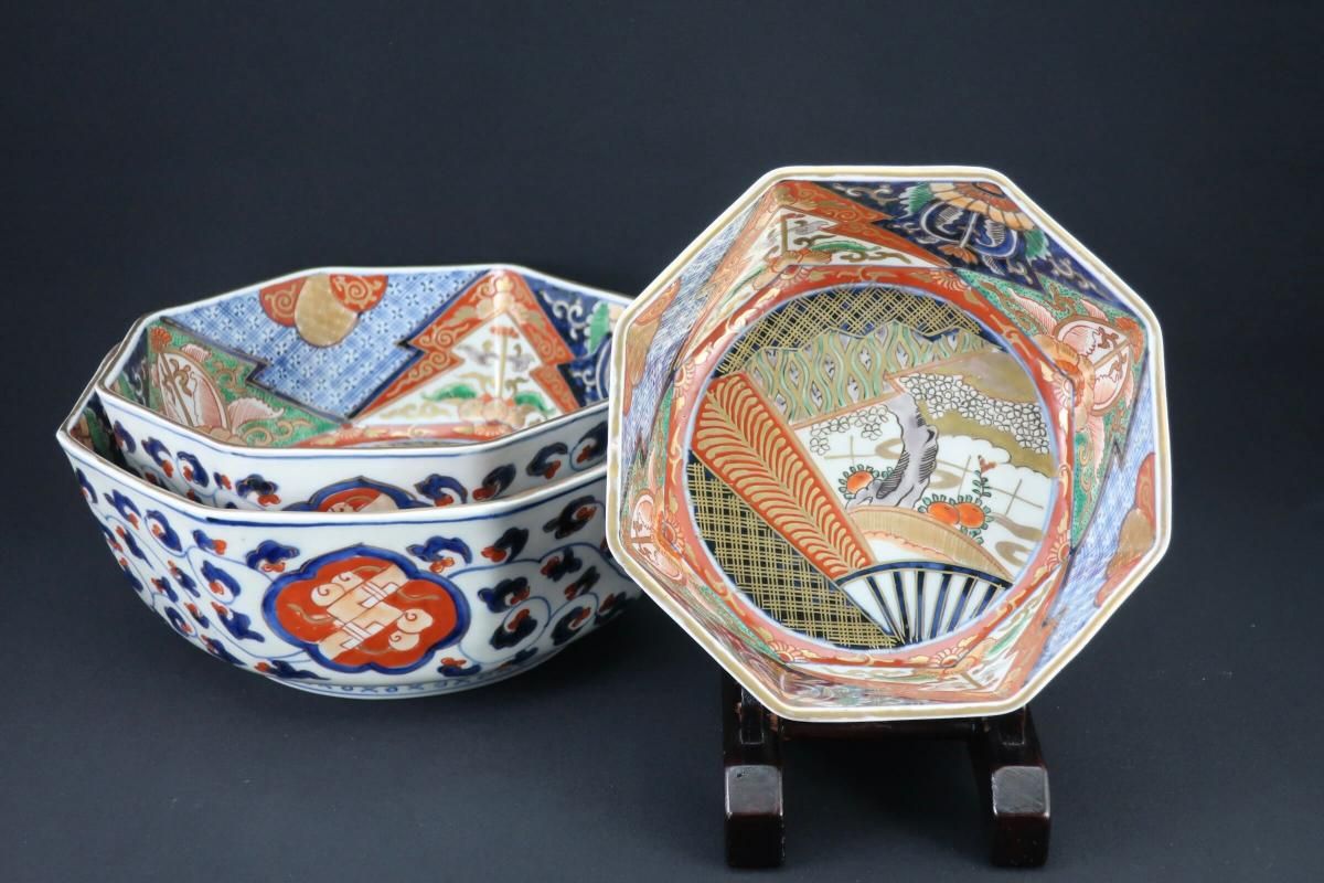伊万里色絵扇面桜文八角三つ組鉢 / Imari Octagonal Polychrome Bowls with the picture of the Fans set of 3 (L/M/S)