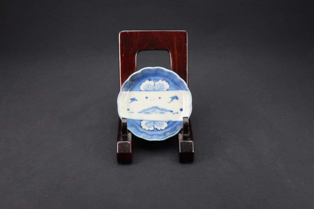 ☆小さいけれど、中央の帯にちゃーんと波千鳥と見てとれる絵付の豆皿。帯から出ている葉は菊の葉でしょうか?ちょっと珍しい絵付の豆皿をコレクションにプラスしてあげてください。