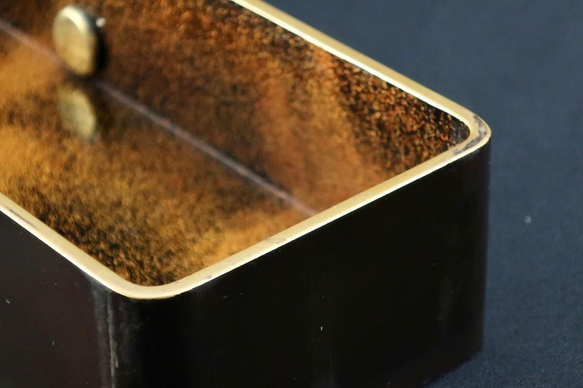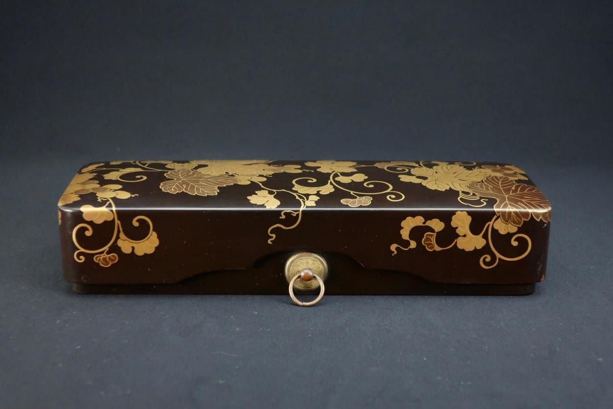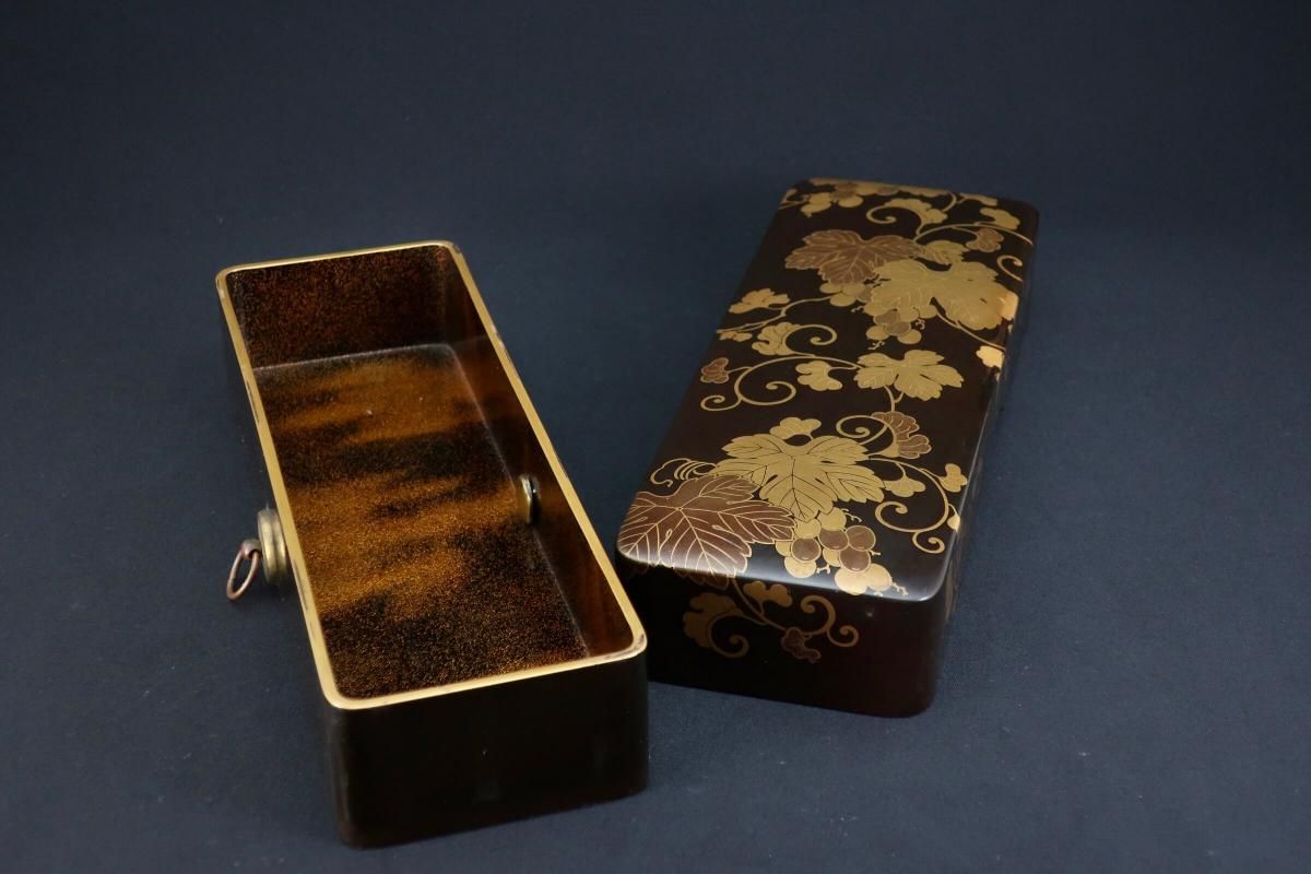 残念ながら真鍮の輪に繋がる紐は朽ちて欠損していますが、箱自体はとても綺麗な状態です。あらゆる色合いの金色で描かれた葡萄の美しいこと。内側に梨地も必見!