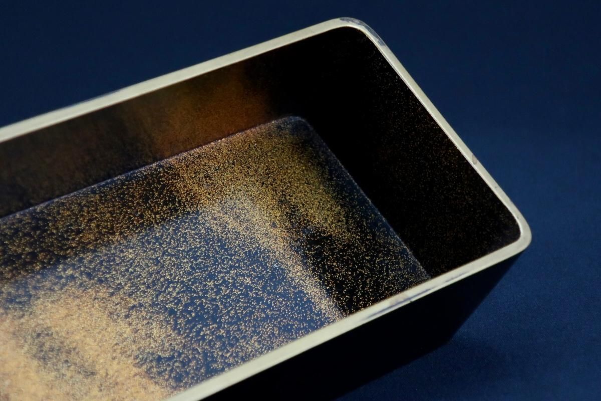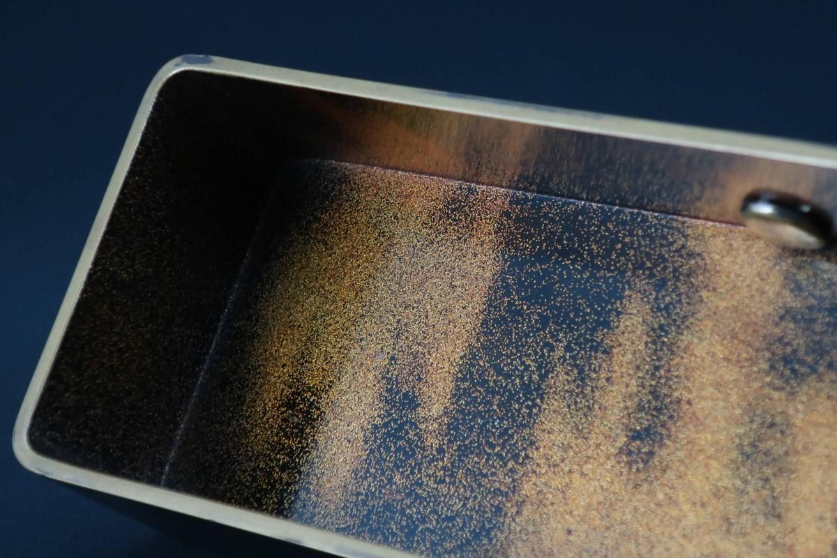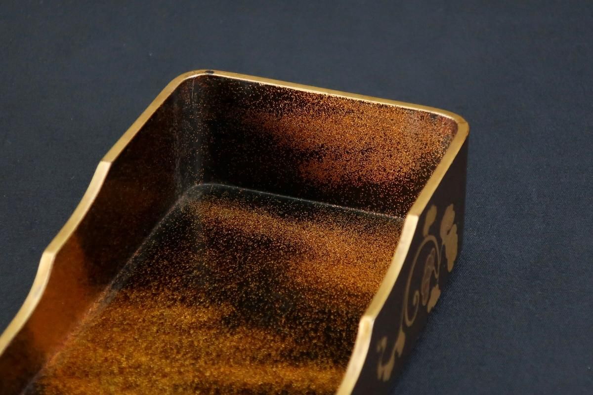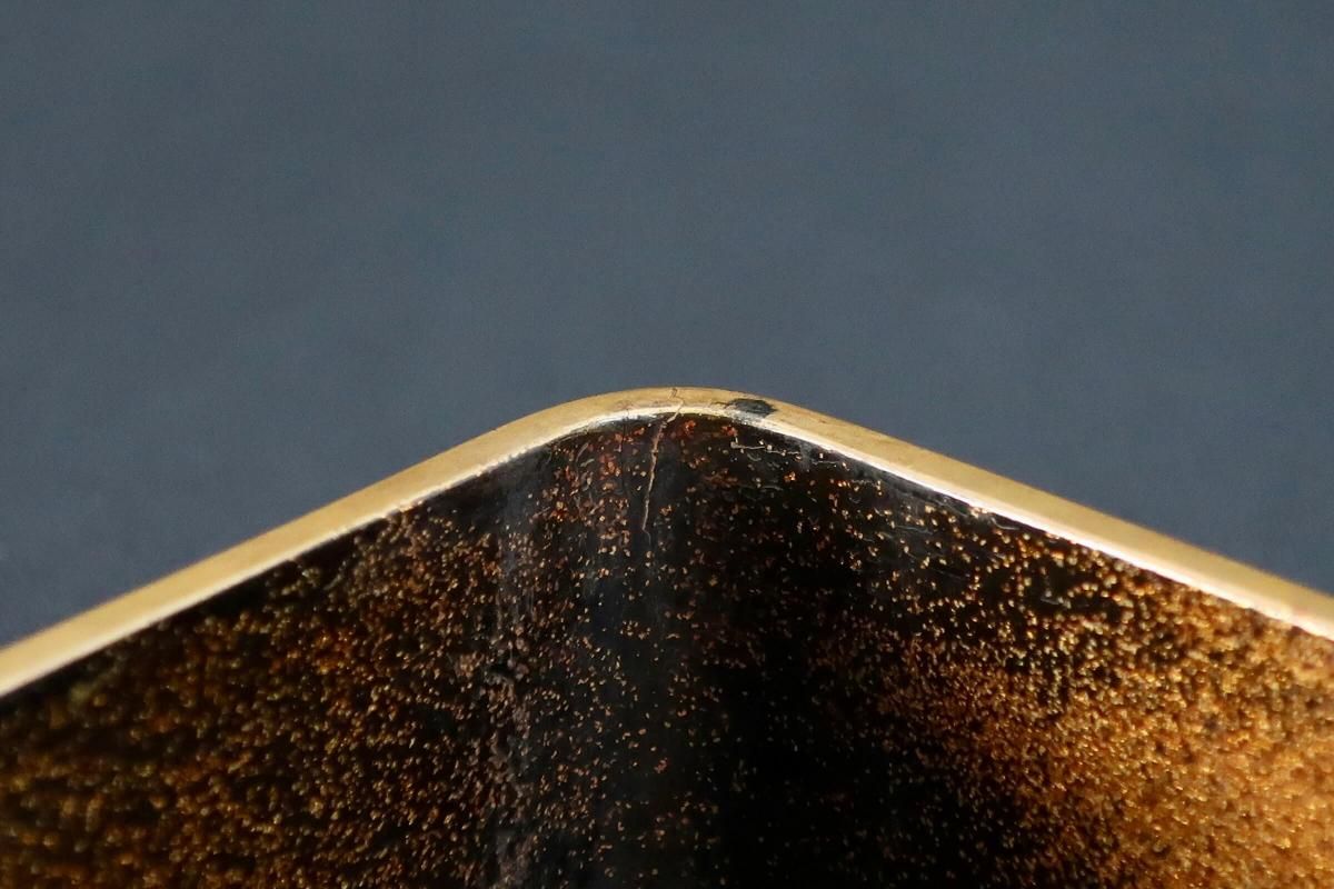 残念ながら真鍮の輪に繋がる紐は朽ちて欠損していますが、箱自体はとても綺麗な状態です。あらゆる色合いの金色で描かれた葡萄の美しいこと。内側に梨地も必見!