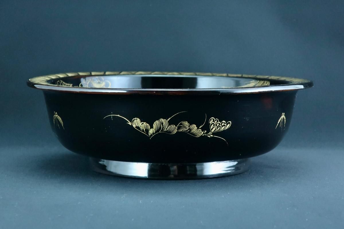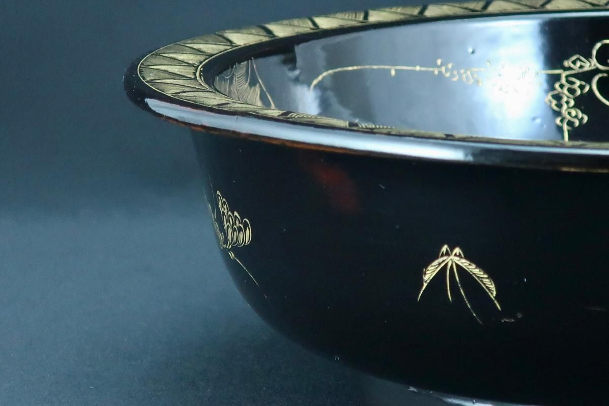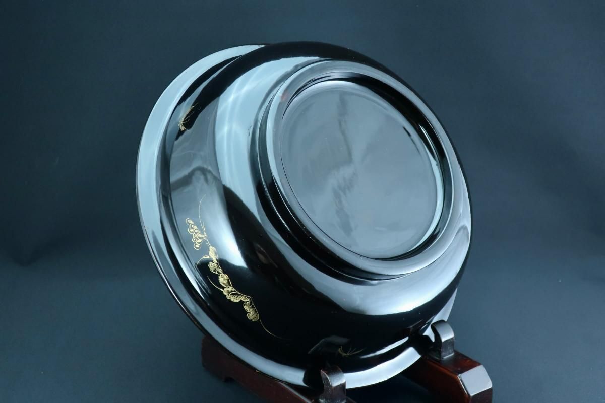 ☆最近ではあまりお目にかからなくなりました。黒漆の大鉢。沈金蒔絵なのでおそらく輪島のものでしょう。四君子の松は縁の装飾が松葉なのでこれを含み四君子とさせていただきました。軽く丈夫な漆鉢は和物やサラダなどの冷静の料理に最適。漆黒とおしゃれな金で美味しく見せてくれそうです。お鍋の野菜などを盛り付けても素敵ですね。