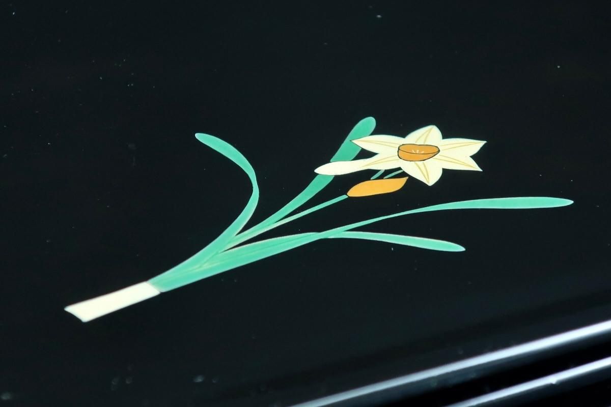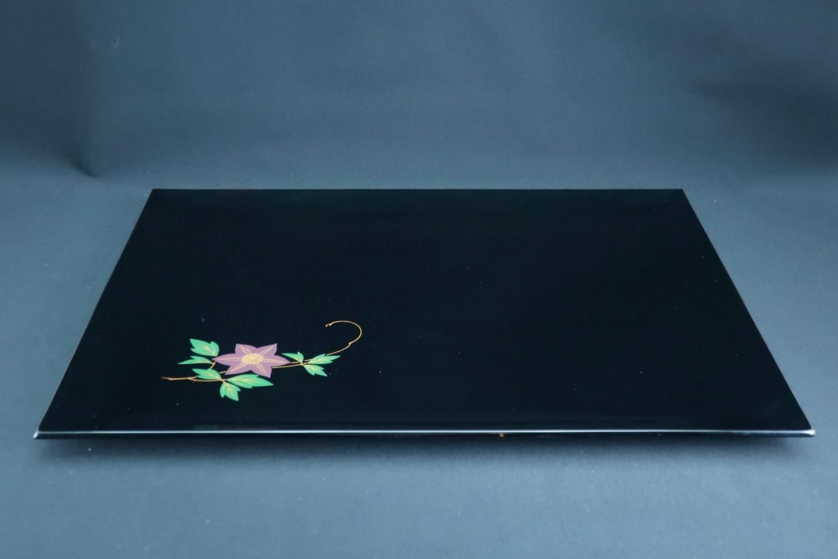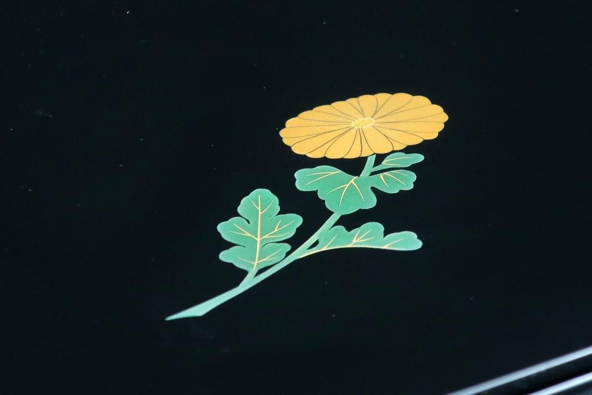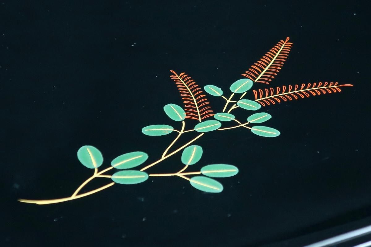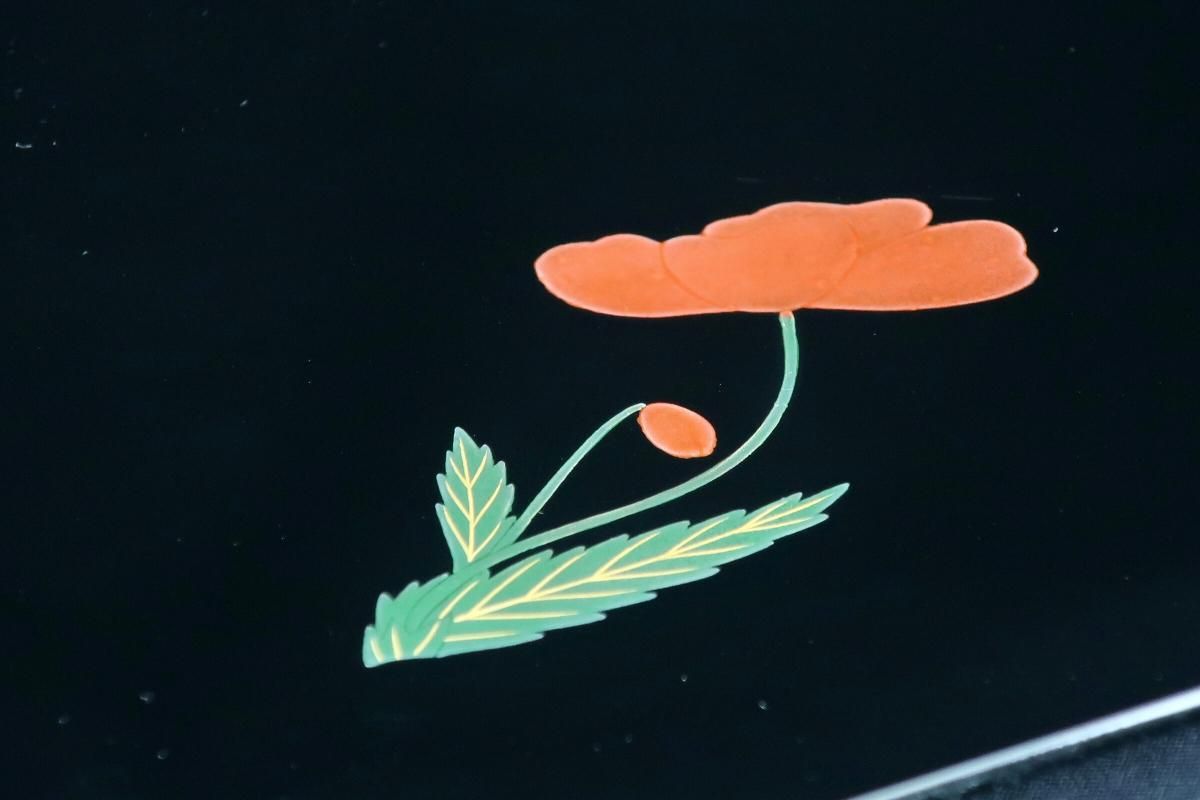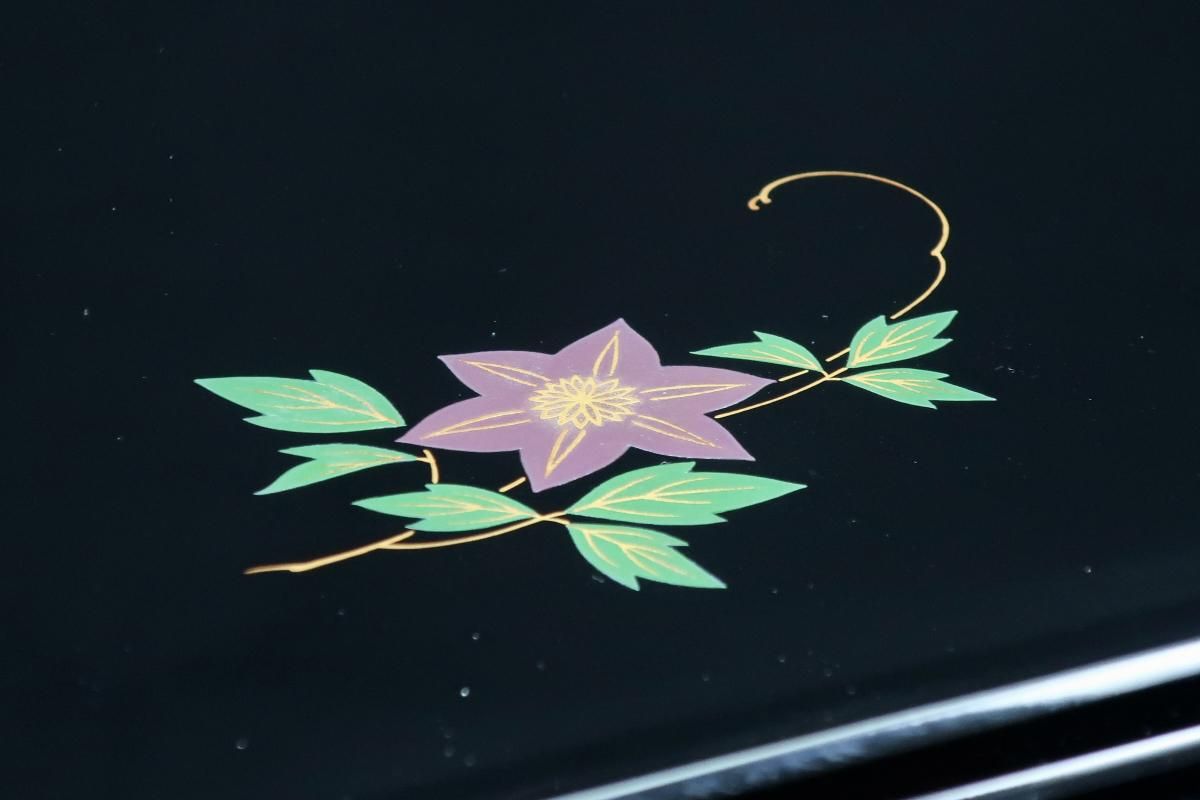 ☆使用頻度が少なかったと思われる卓上膳。綺麗すぎてとっておきとして仕舞い込んでいたのでしょうか?見事な漆黒の光沢の表面にカラフルなワンポイントの花々が美しく映えています。ほんの少しだけ縁がそり上がっているのもなんとなくモダンな感じがします。