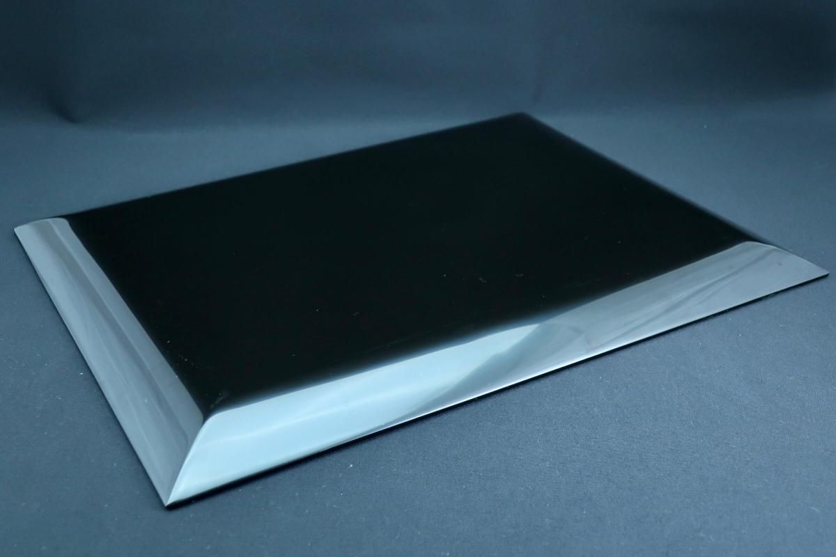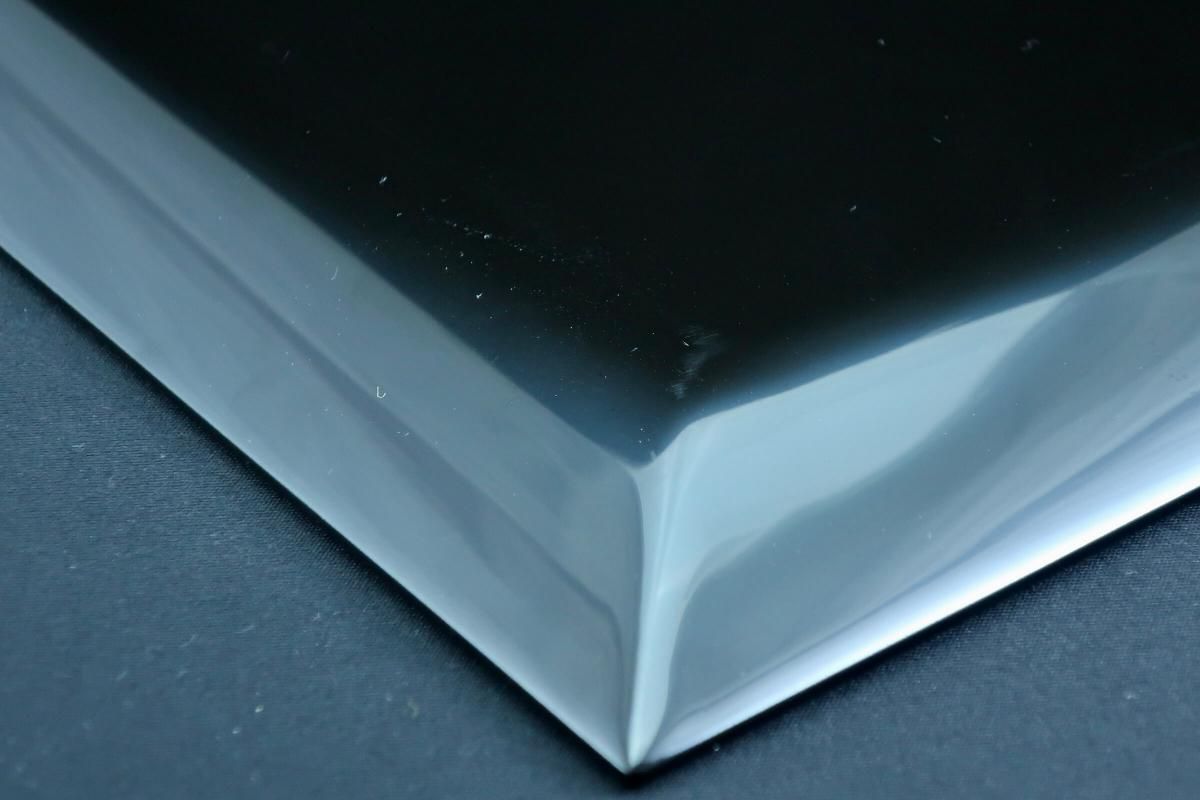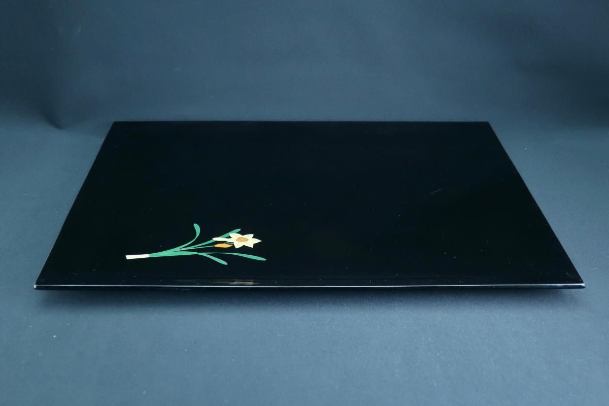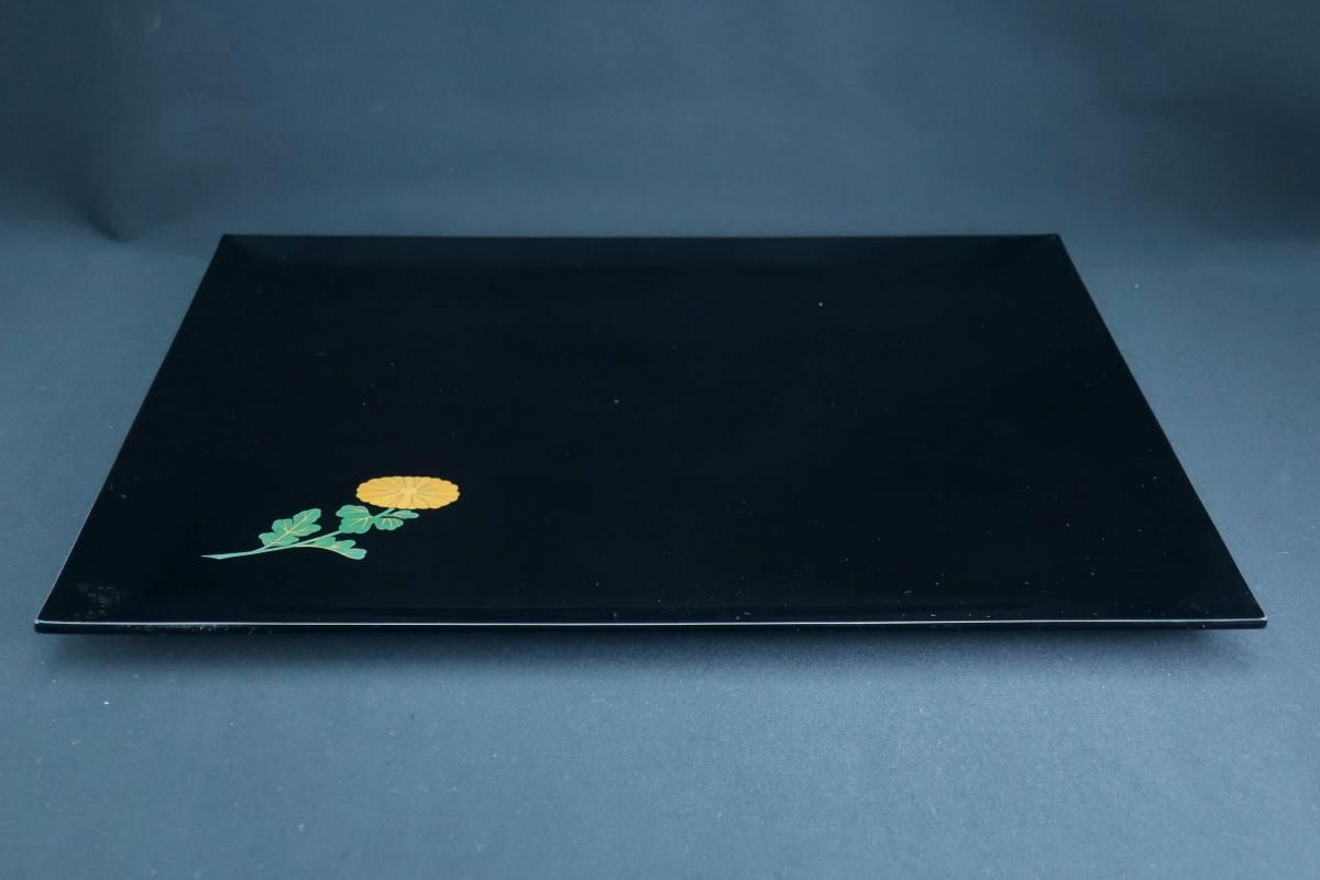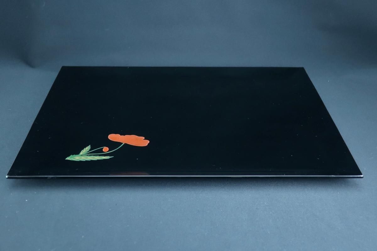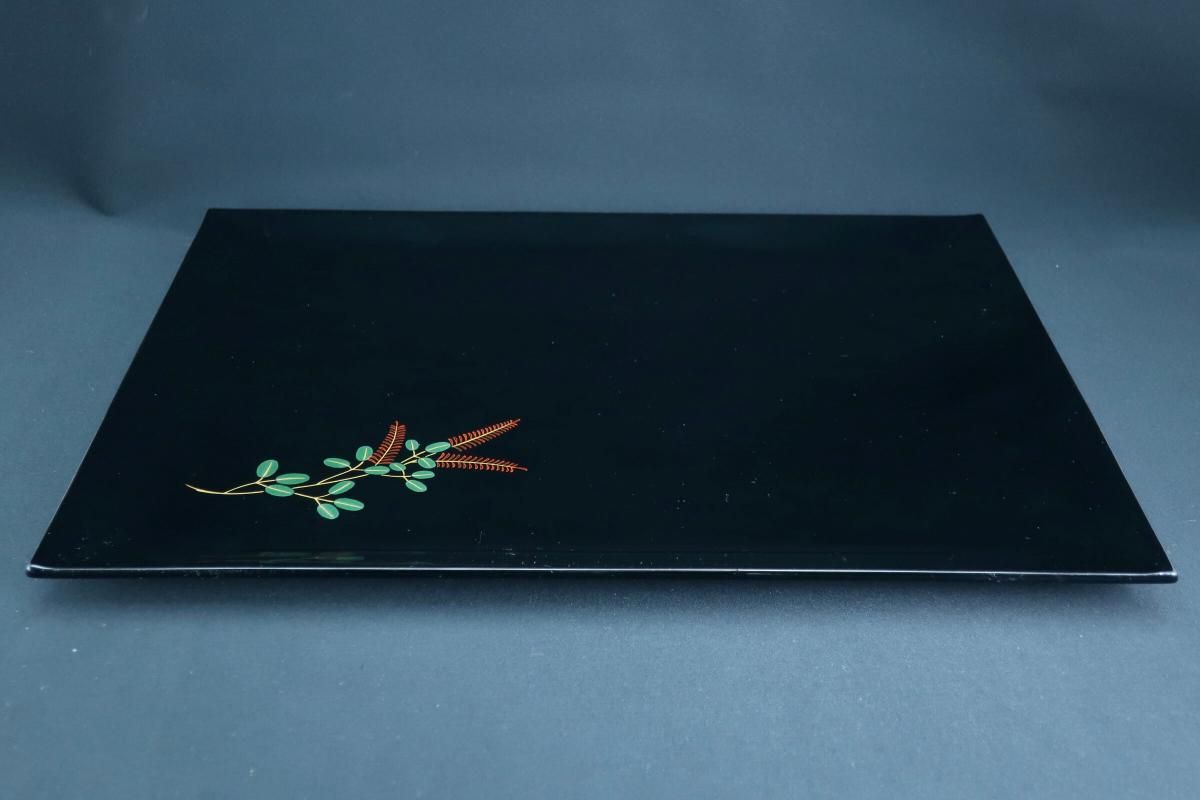 ☆使用頻度が少なかったと思われる卓上膳。綺麗すぎてとっておきとして仕舞い込んでいたのでしょうか?見事な漆黒の光沢の表面にカラフルなワンポイントの花々が美しく映えています。ほんの少しだけ縁がそり上がっているのもなんとなくモダンな感じがします。