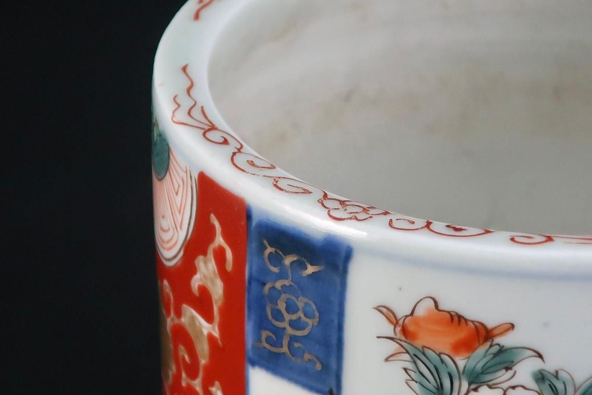 ☆珍しい大きめの火入のご紹介。こんな火入が入っていた煙草盆もさぞ大きな立派なものだったことでしょう。絵柄は主役の牡丹と金彩赤絵、ちょこっと添えられた丸文が良いバランスで描かれています。ハーフボトルサイズなら小さなワインクーラーとしても楽しめます。