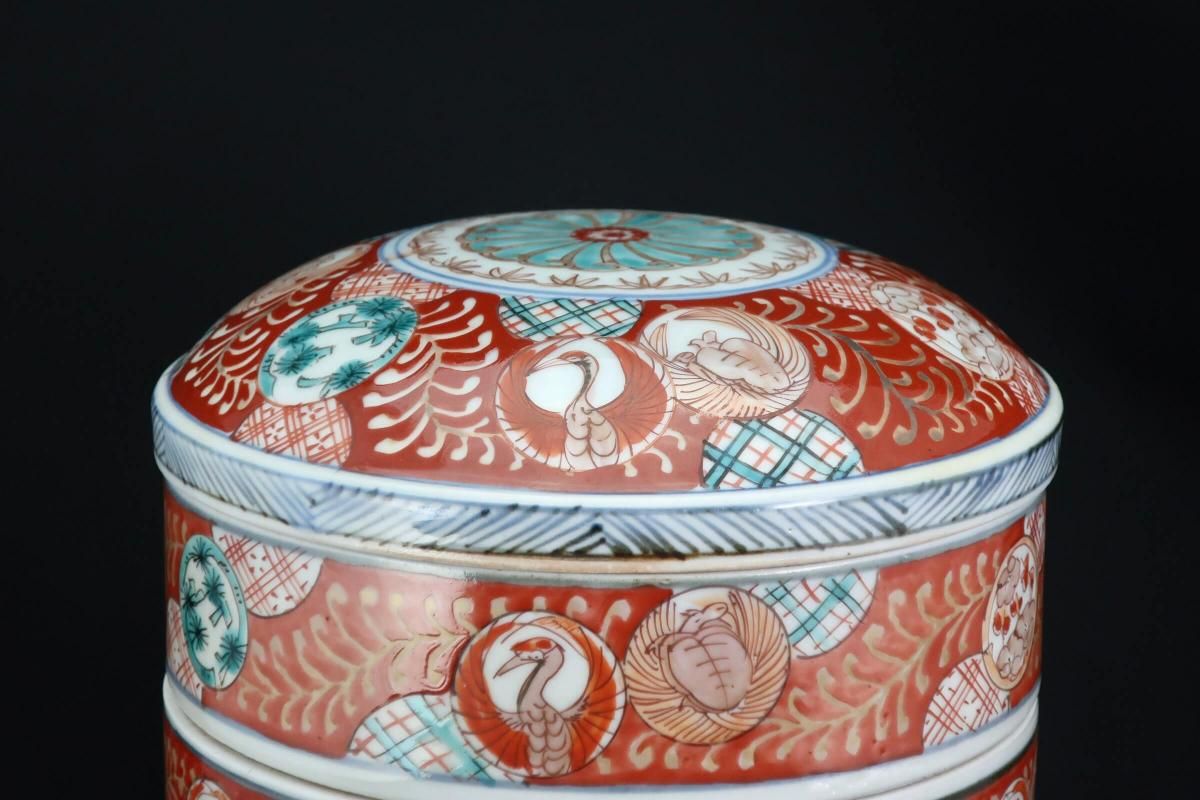 伊万里色絵金彩赤絵鶴亀丸文段重 / Imari Round Polychrome 'Danju' Food Boxes with the picture Cranes and Tortoises