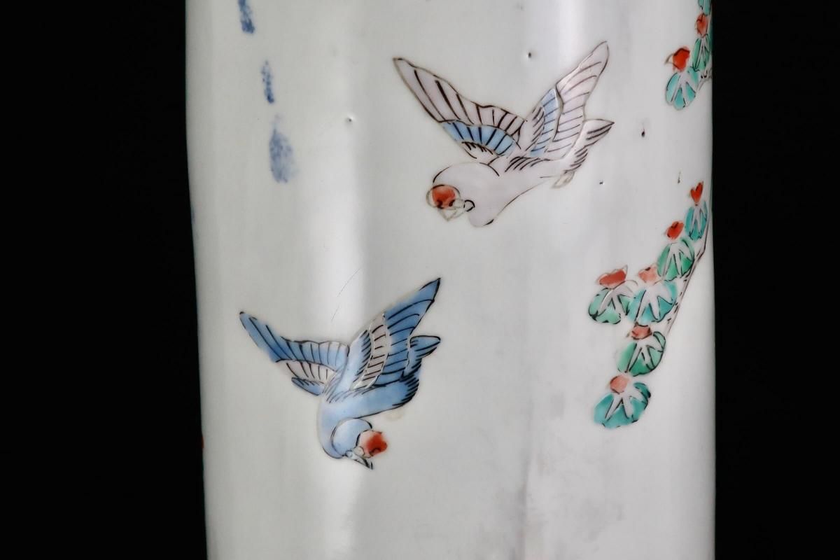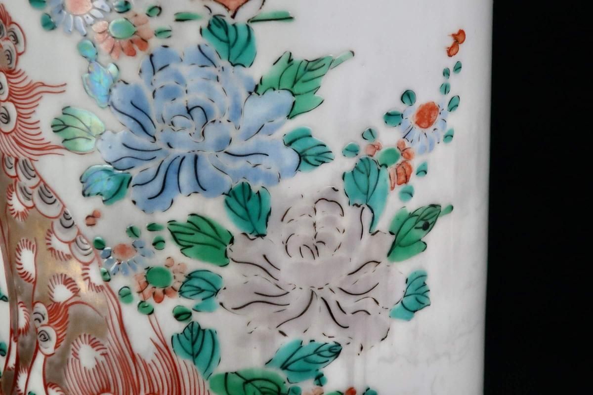 ☆ビヨ〜ンと伸びをして何かを狙っているかのような表情の獅子と美しい牡丹の花や鳥達が綺麗な絵付けの筒形の花瓶。シンプルな枝物を入れたら素敵かもしれません。