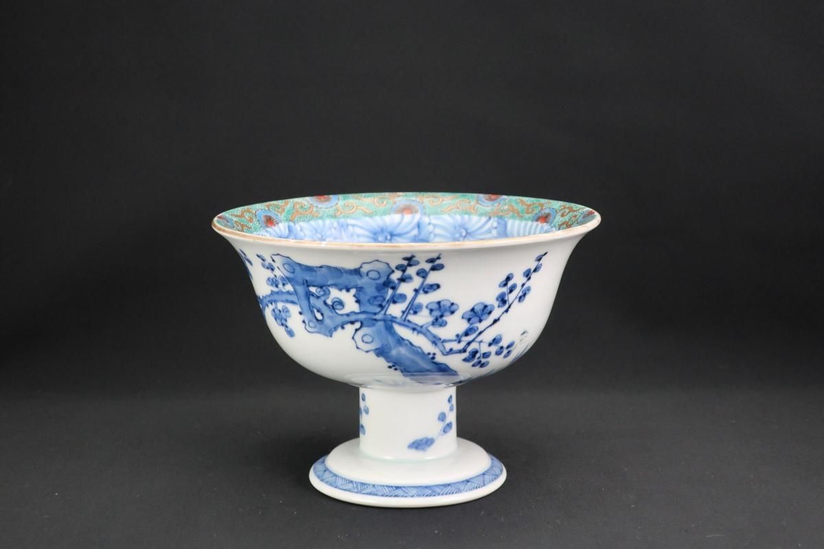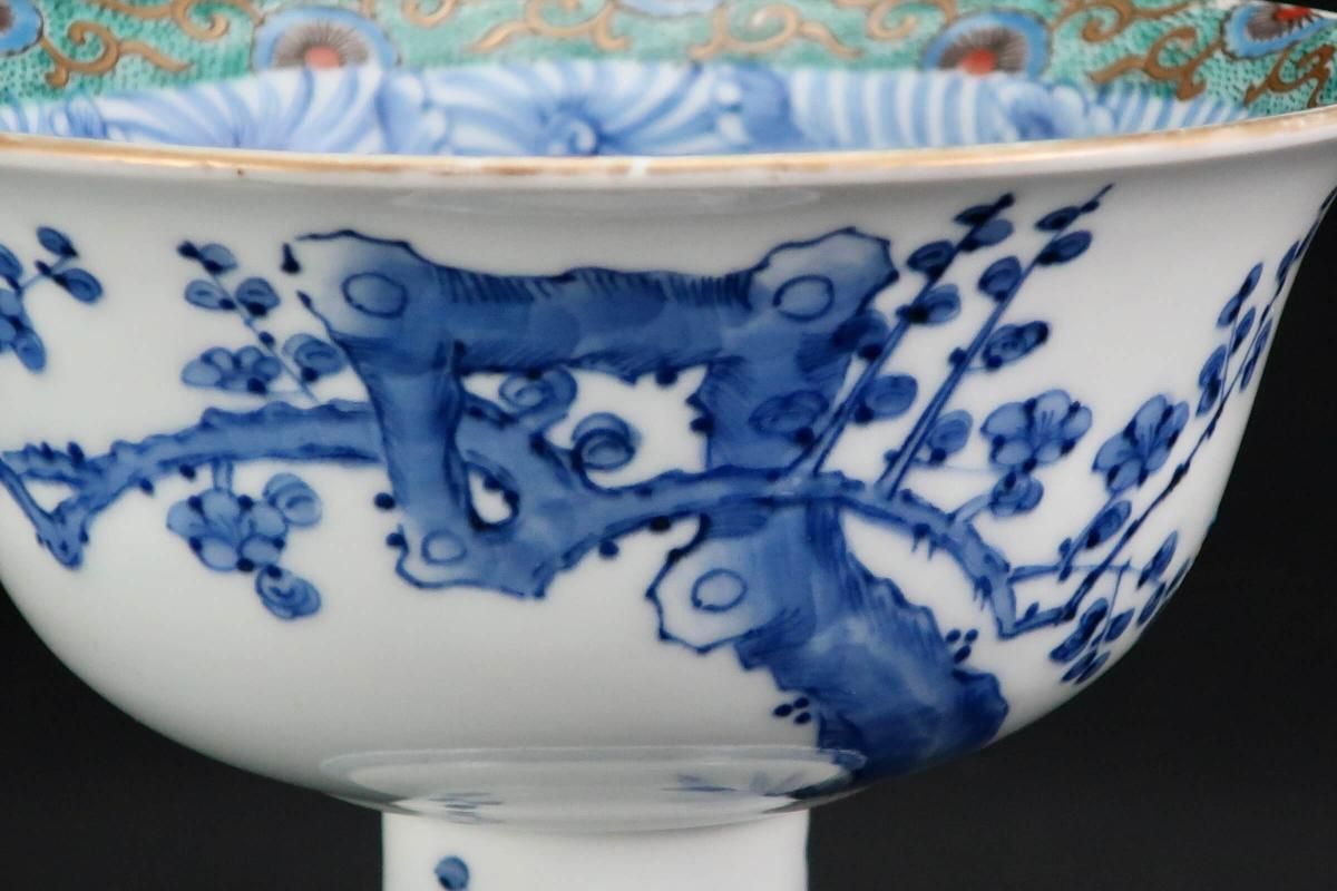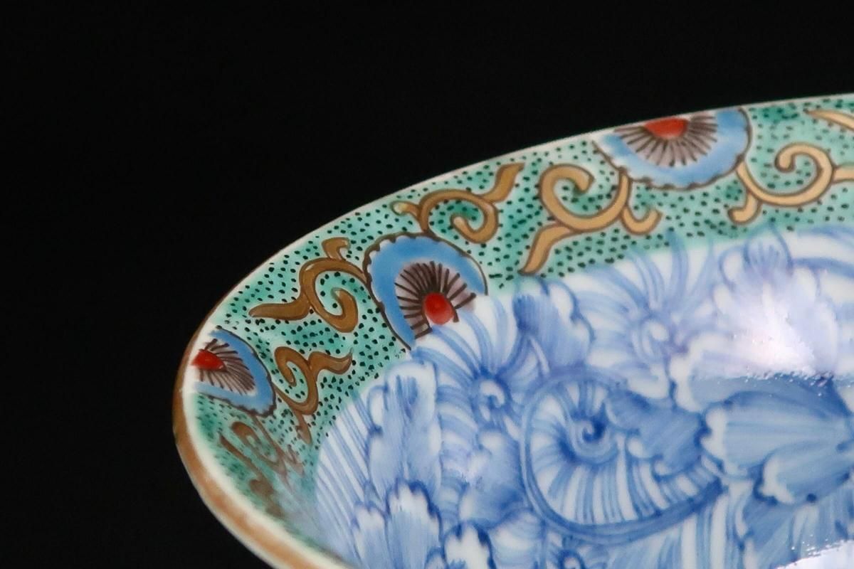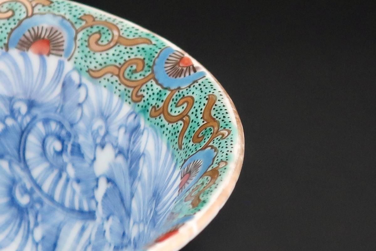 ☆縁が薄く繊細なつくりの盃洗。ミントグリーンの縁の絵付けと細やかな線描の牡丹の花とも綺麗に調和しています。外側は梅に鶯。風流な絵付けに凛とした形の盃洗はテーブルを品格あるものにしてくれそうです。
