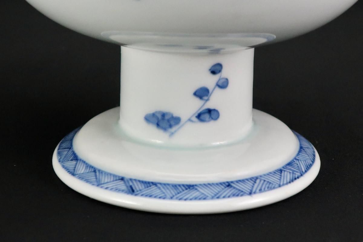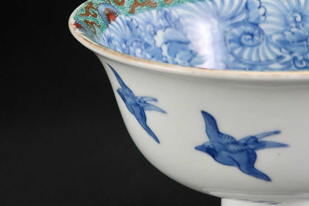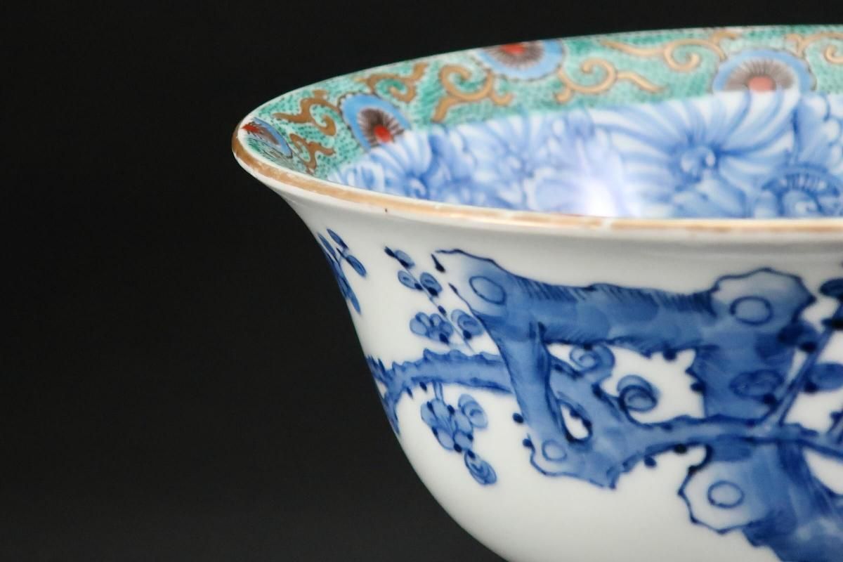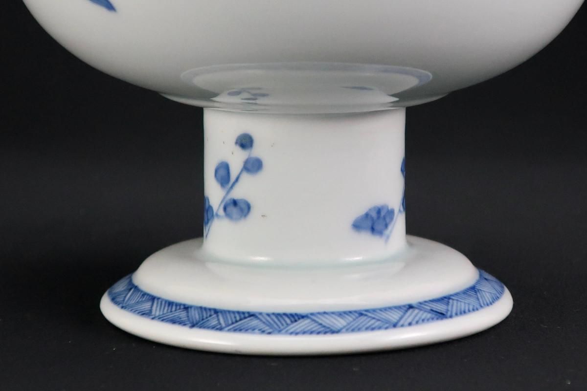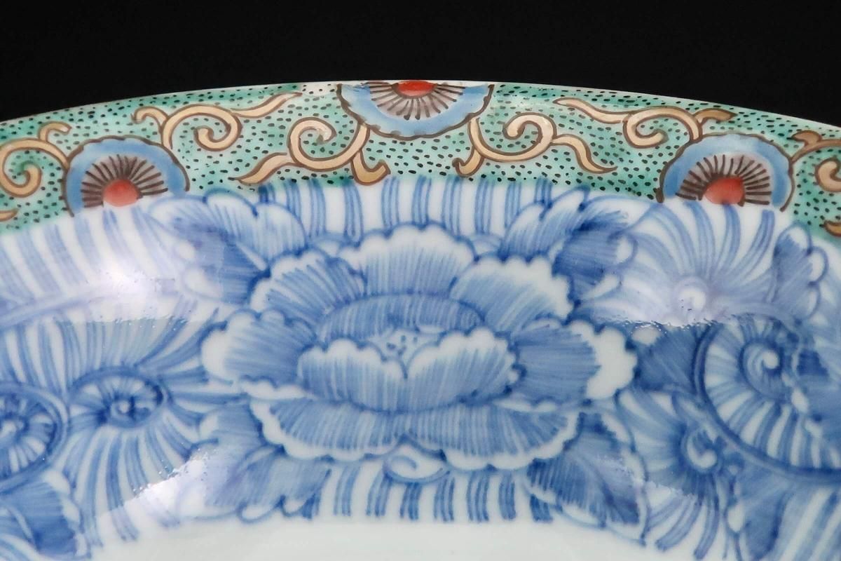 ☆縁が薄く繊細なつくりの盃洗。ミントグリーンの縁の絵付けと細やかな線描の牡丹の花とも綺麗に調和しています。外側は梅に鶯。風流な絵付けに凛とした形の盃洗はテーブルを品格あるものにしてくれそうです。