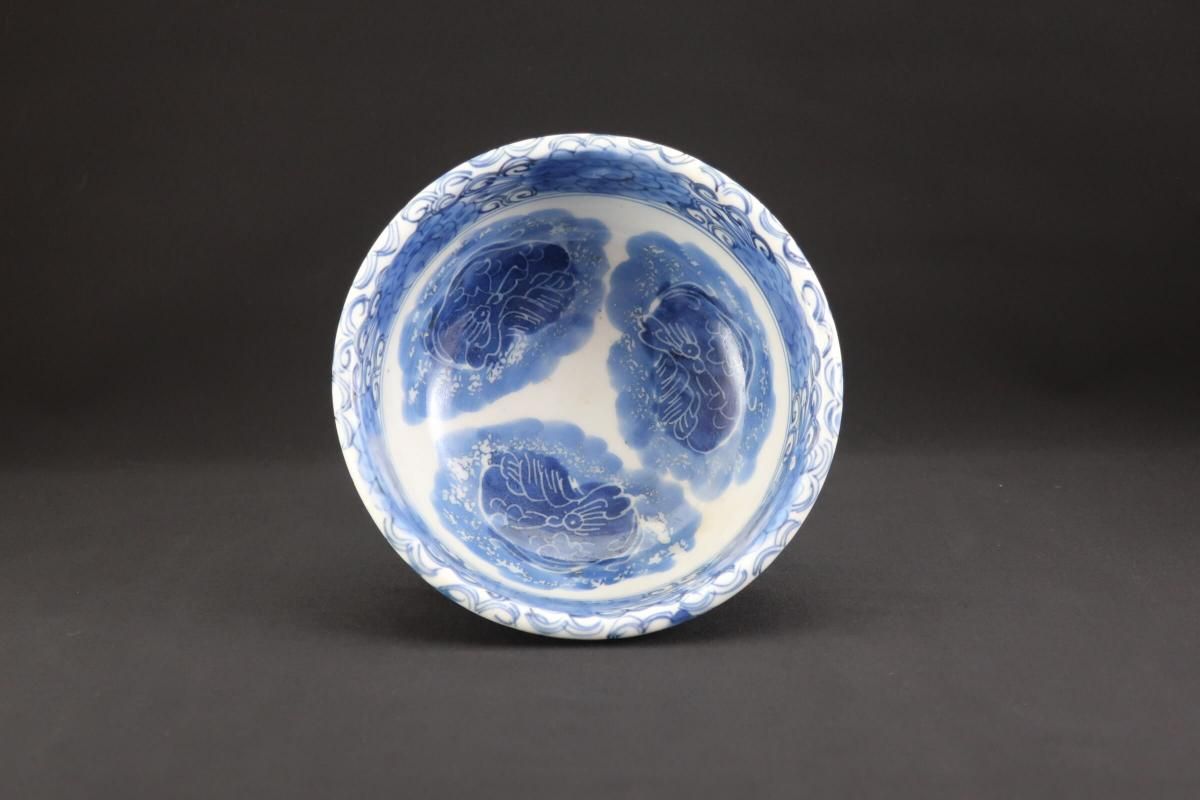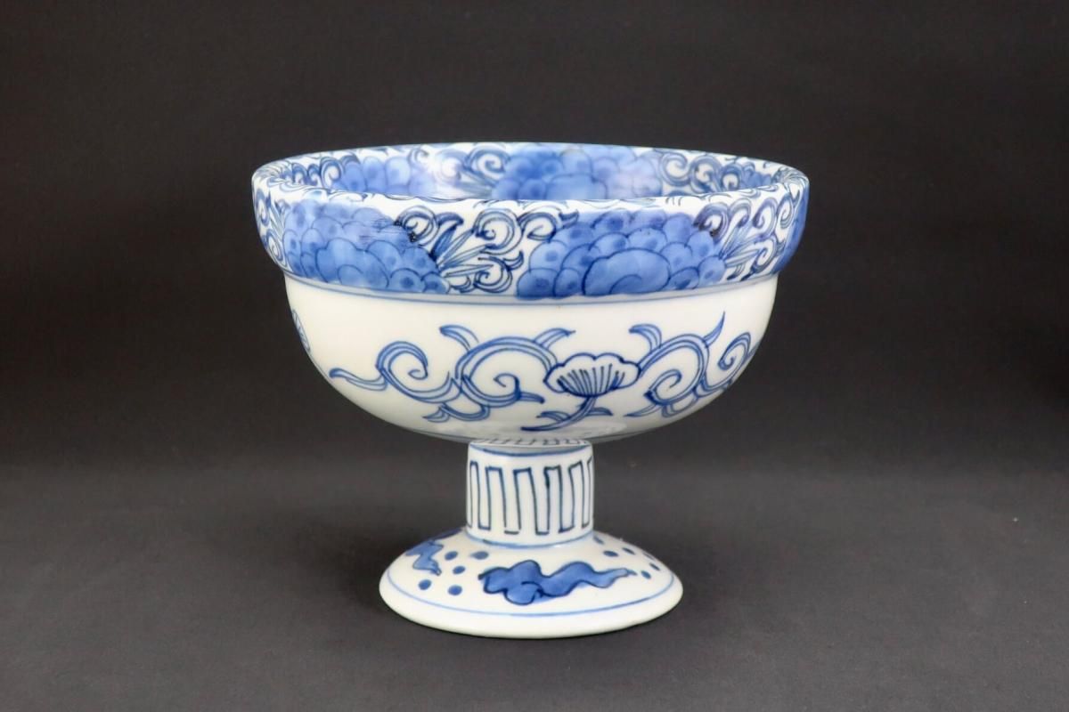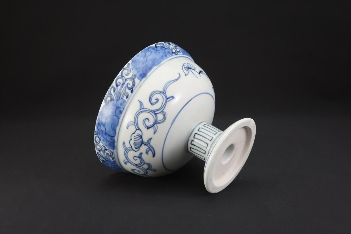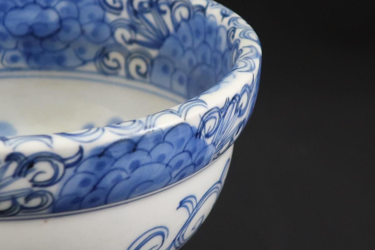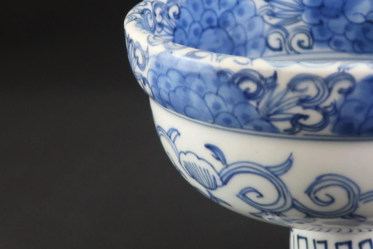 ☆縁が厚く丈夫なデザインの染付盃洗。葡萄のような図が描かれていますが、デフォルメされた牡丹の花のようにも見えます。他にも絵付の工夫が見られます。どこから見ても絵付が綺麗に見えるので飾っているだけで楽しめそうですね。