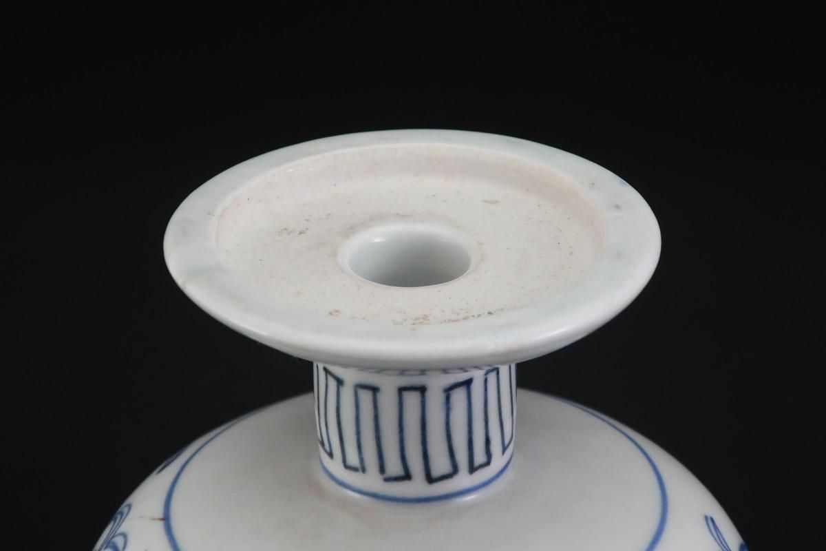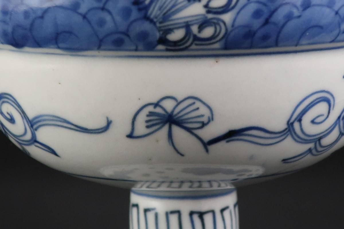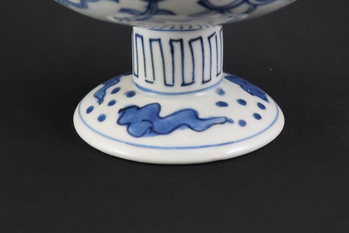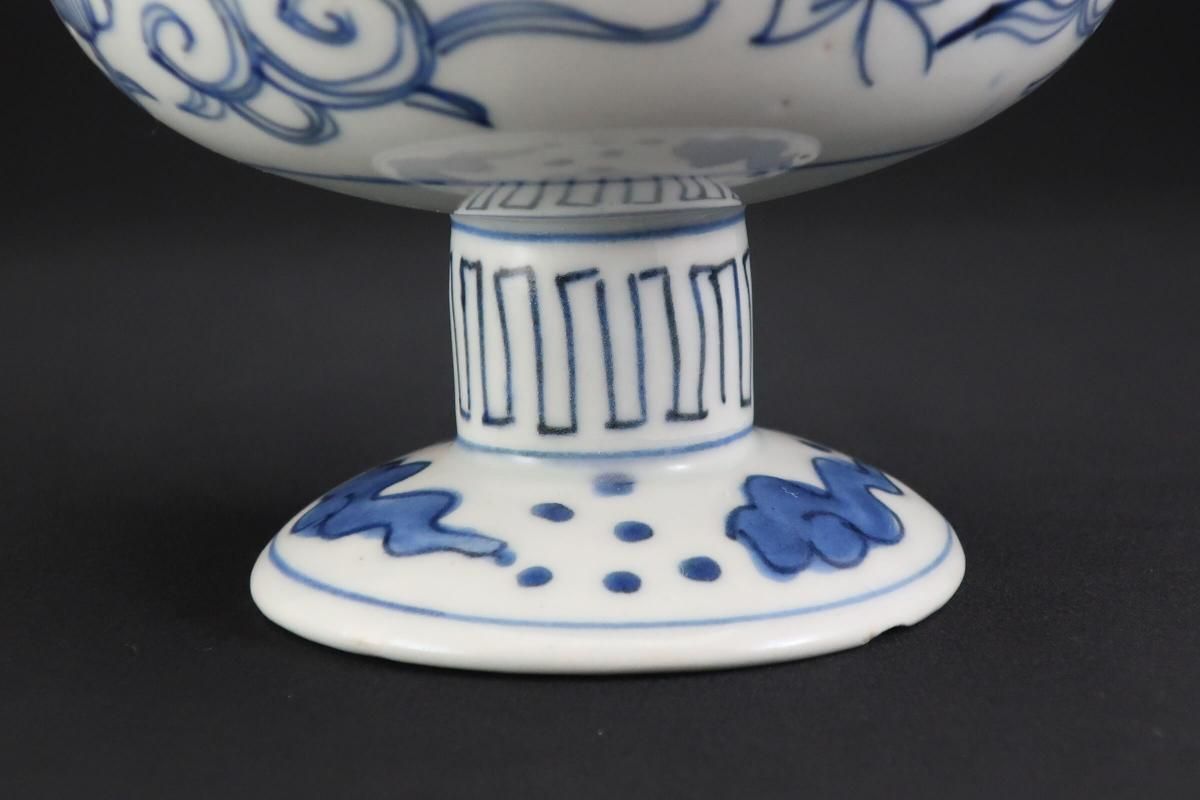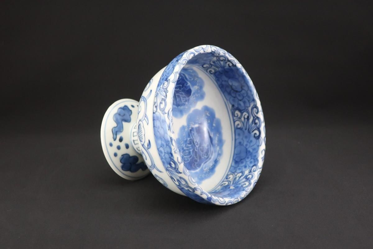 ☆縁が厚く丈夫なデザインの染付盃洗。葡萄のような図が描かれていますが、デフォルメされた牡丹の花のようにも見えます。他にも絵付の工夫が見られます。どこから見ても絵付が綺麗に見えるので飾っているだけで楽しめそうですね。