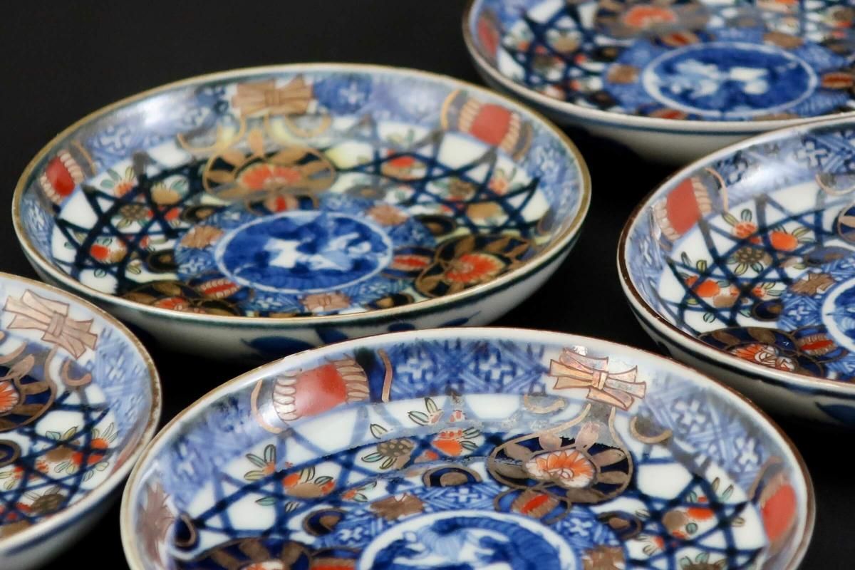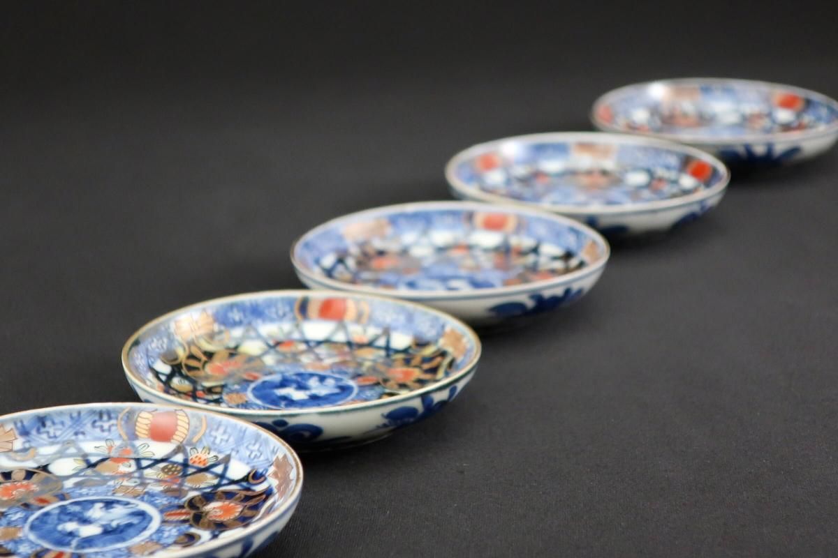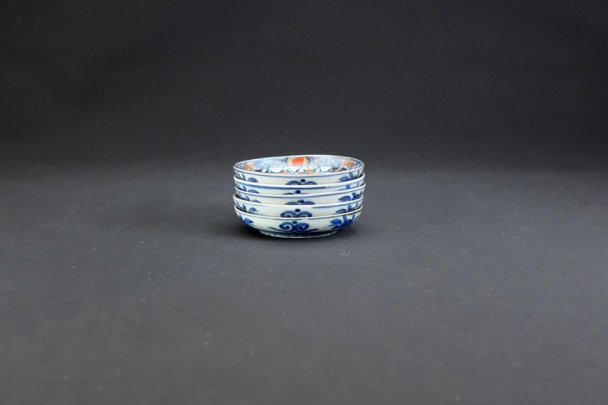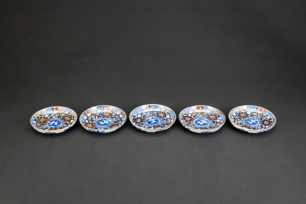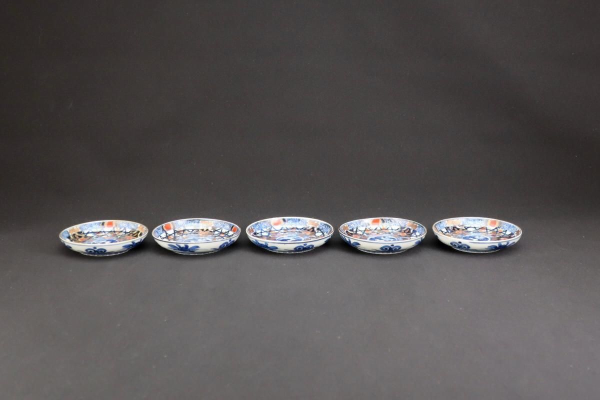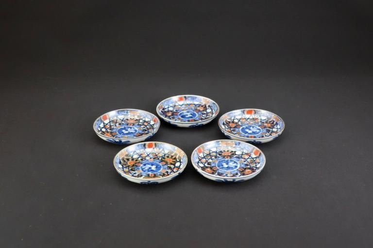 伊万里色絵籠目草花文豆皿 五枚組 / Imari Small Polychrome Plates with Woven-bamboo pattern