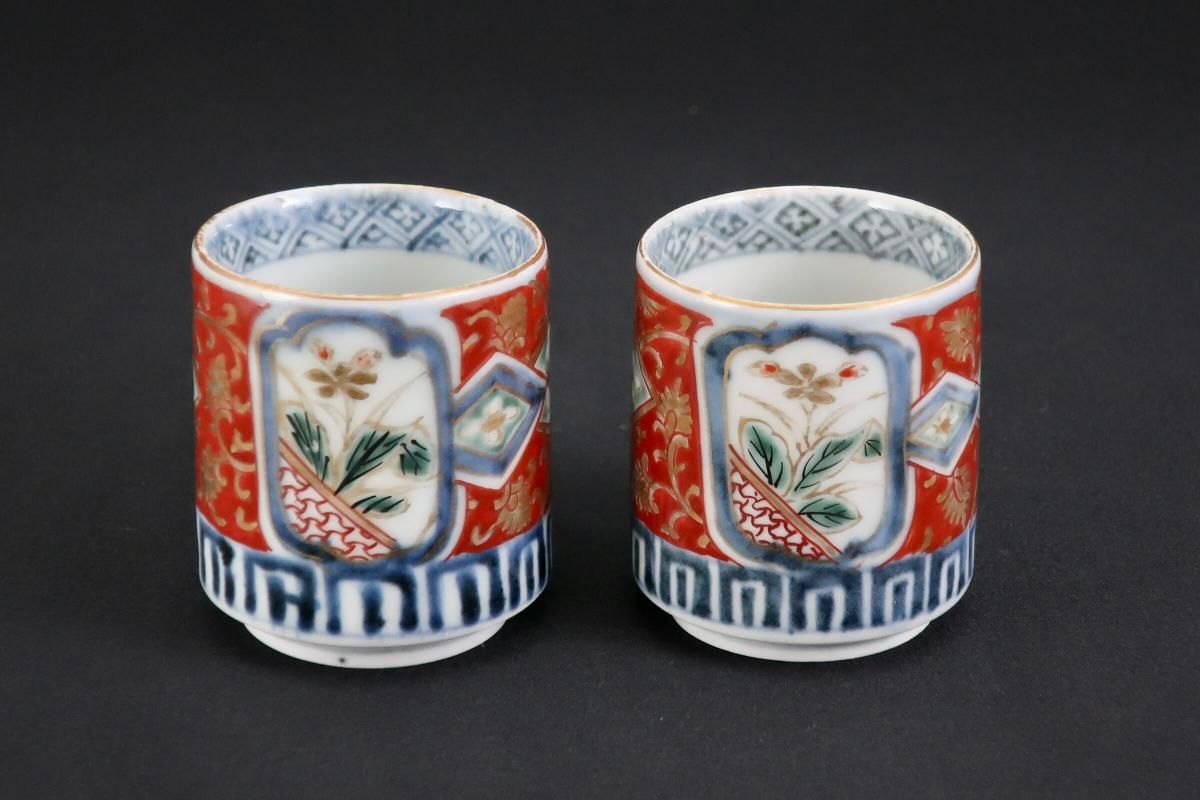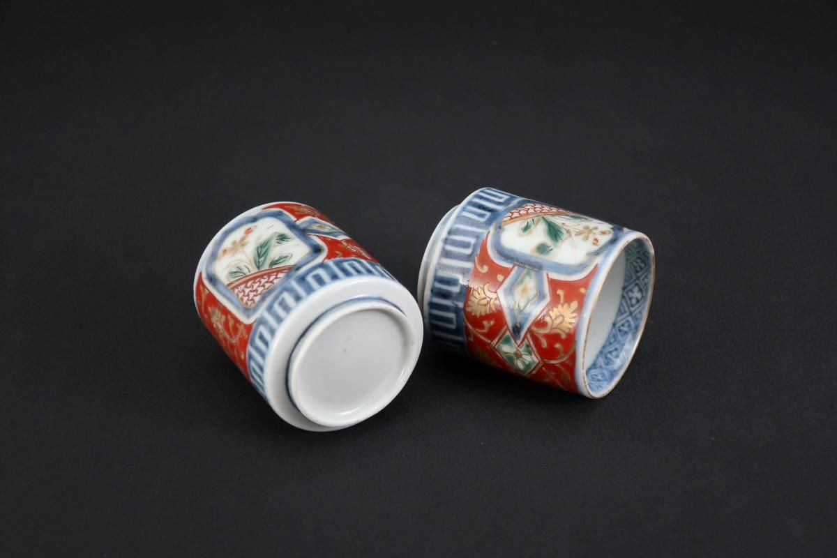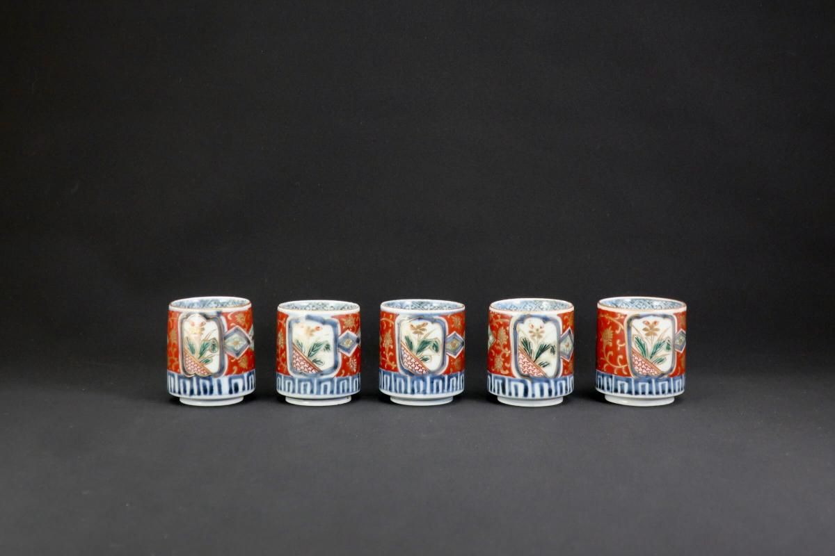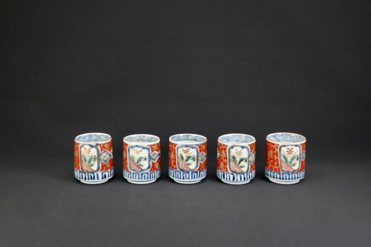 伊万里色絵金彩赤絵窓絵文覗猪口 五客組 / Imari Small Polychrome Vinegar Cups set of 5