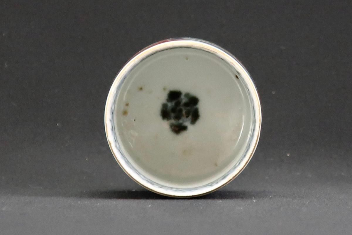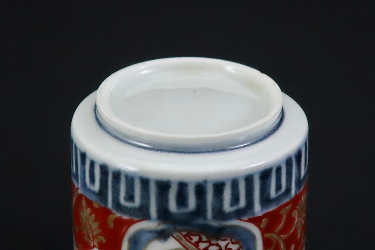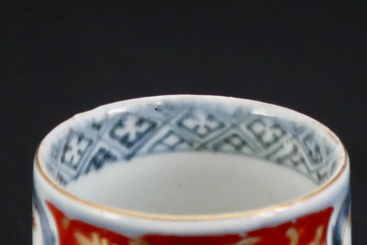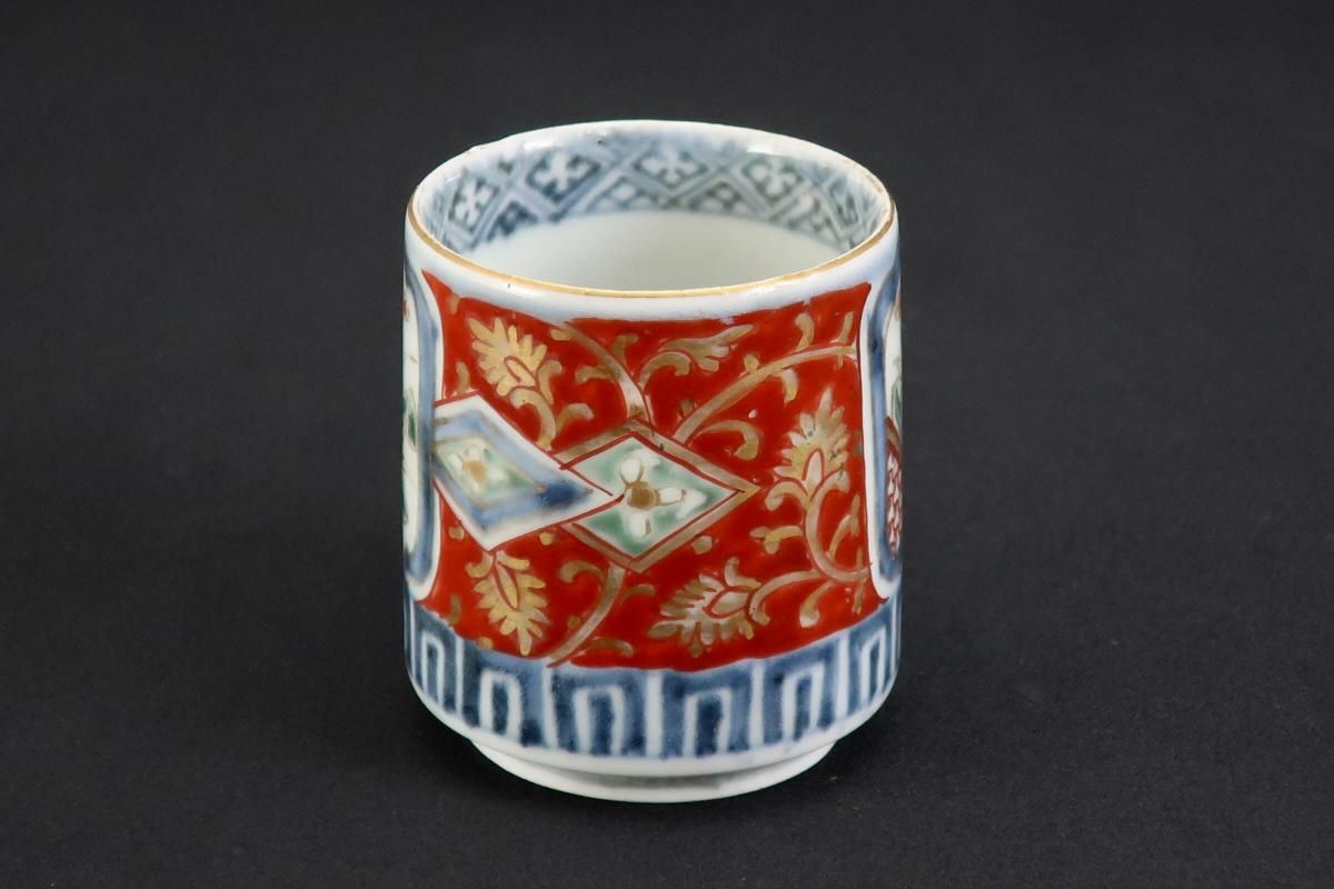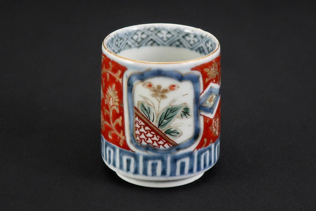 ☆古い時代の覗猪口はこのような筒形が多く、特に色絵は絵付が華やか。金彩赤絵と四方襷文、見込みの五弁花など、古伊万里の特色がはっきり見られる小さな器です。元々の使い方(調味料などを入れて添える)の他、小さく料理を盛り付けて並べてみたり、酒器としても楽しめます。