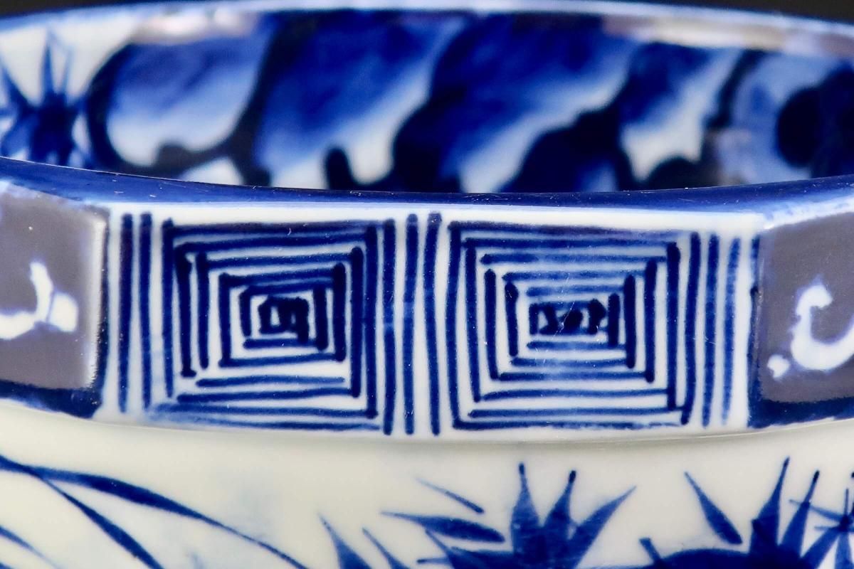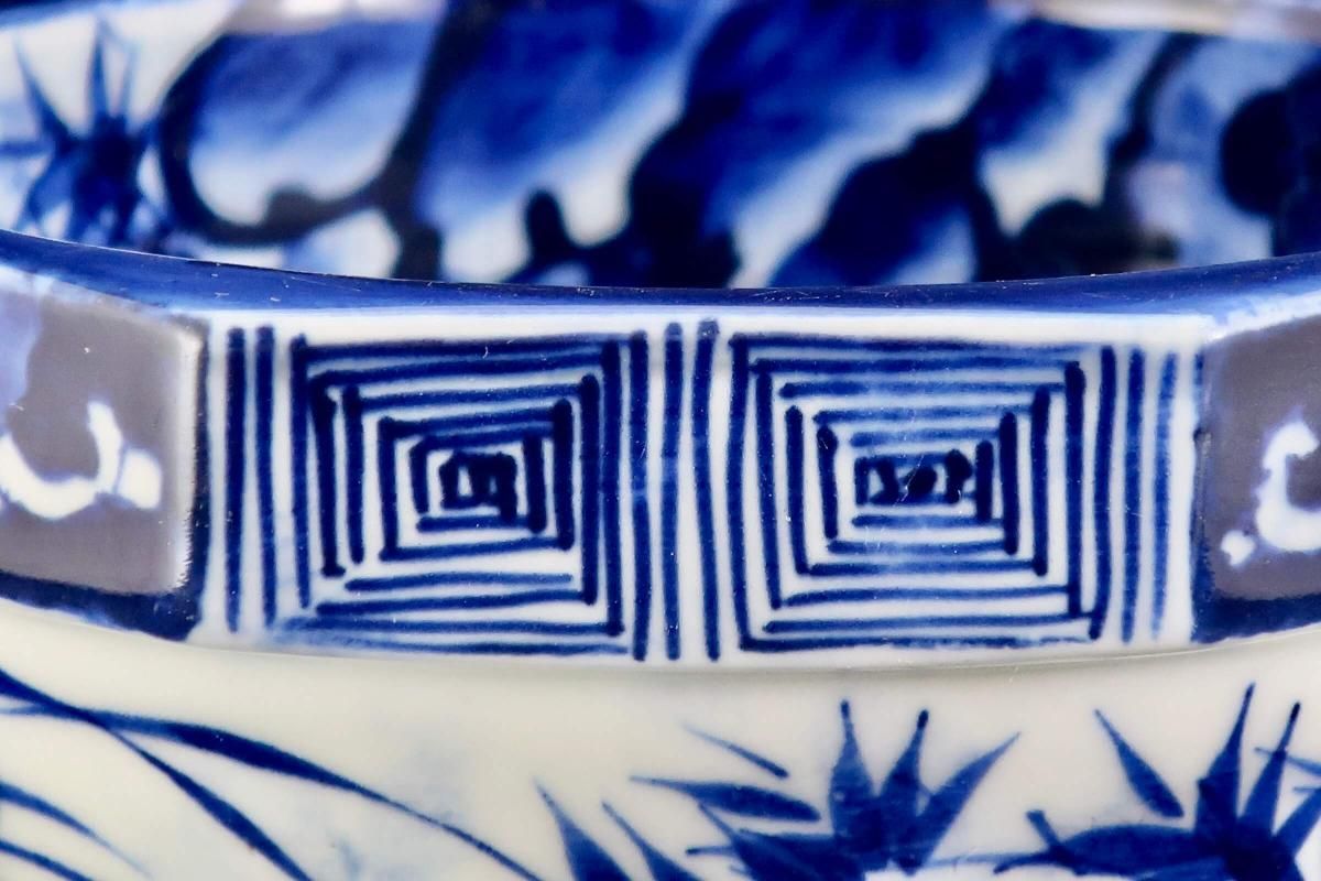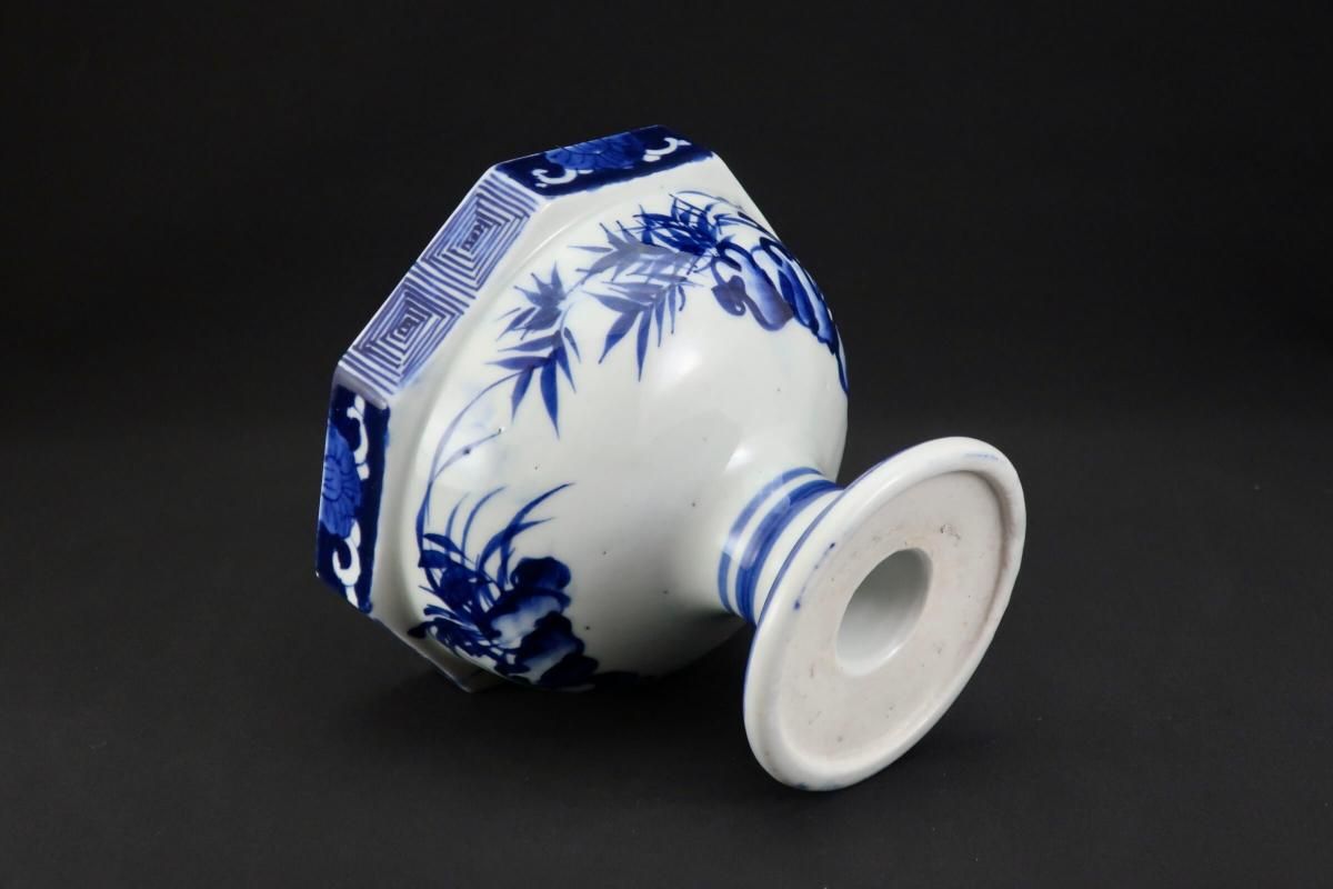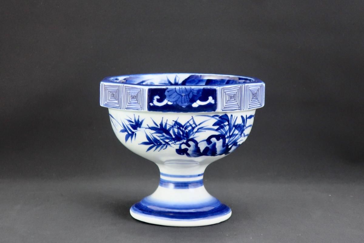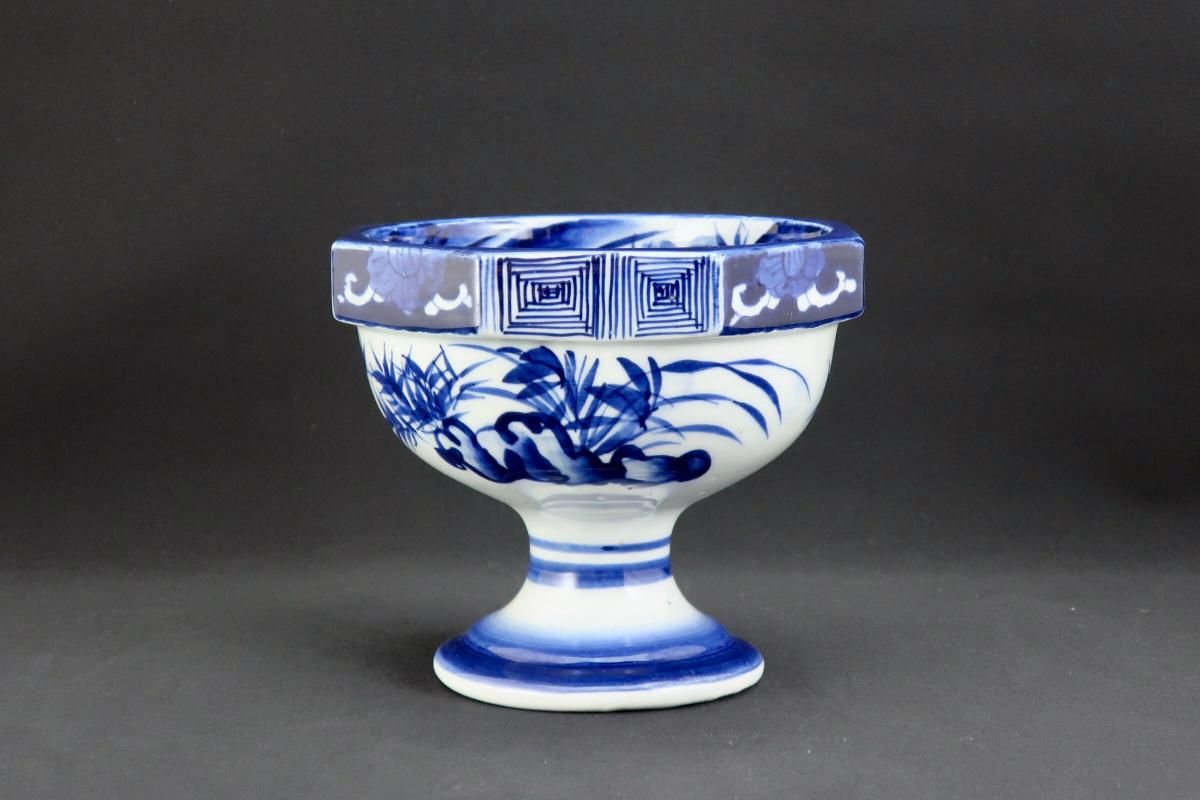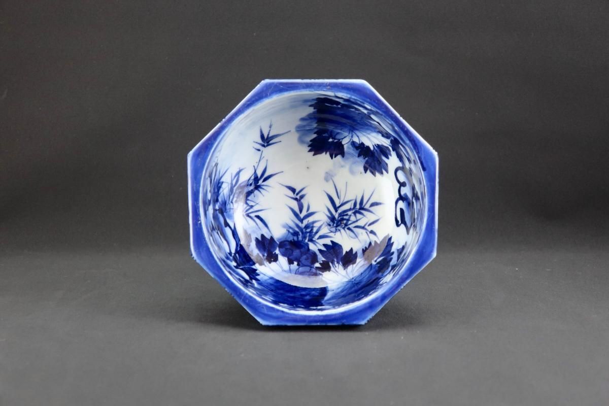 ☆明治以降に見られるベロ藍の盃洗。発色の良い輸入ものの顔料で描かれた絵付けが際立っています。八角系の形も珍しく、テーブルに置いてあるだけでその場を明るくしてくれそうです。