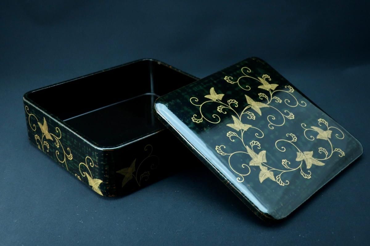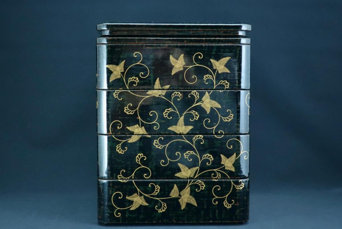 ☆黒を基調にしてさりげなくグリーンが織り込まれたような表面に金の唐草蒔絵が施された趣深い四段重。小さめで使いやすく、おせちだけでなくさまざまなシーンで活躍してくれます。オードブルを数種類作っておいて準備するなど、蓋をする事で料理の乾燥も防ぐ事が出来、とても便利。