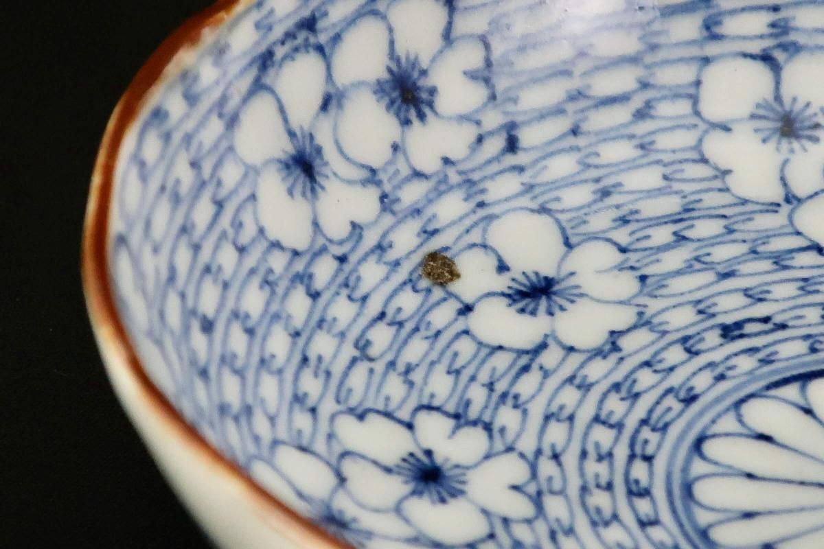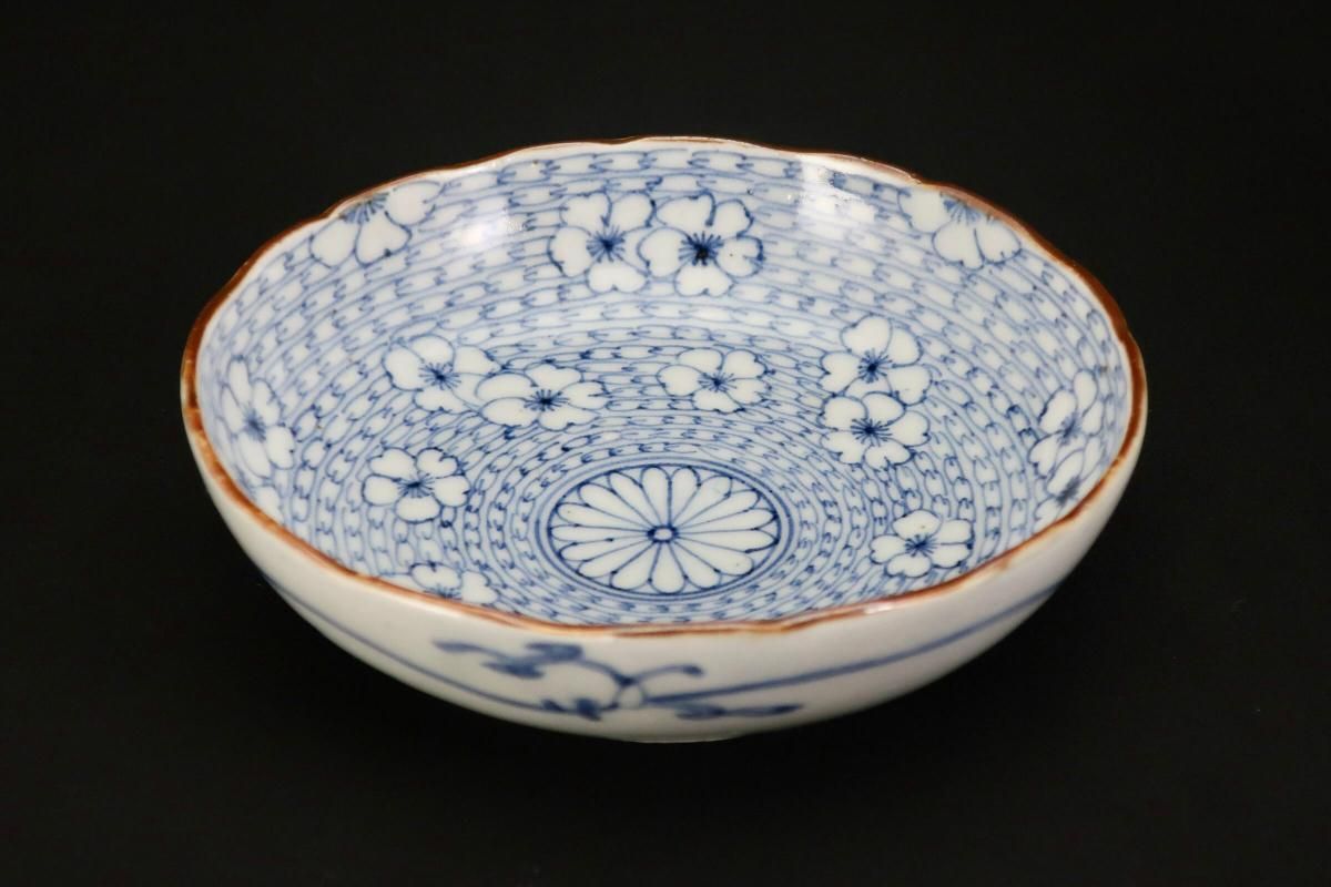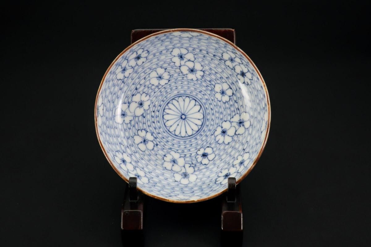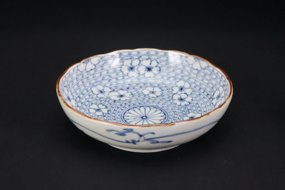 ☆潔さを感じられる桜尽くしの文様と、見込みの菊の花が印象的ななます皿。均一に引かれた呉須のラインの美しさは熟練工のなせる技。裏底の「渦福」は良品の証。古の陶工さんのセンスが光る逸品です。